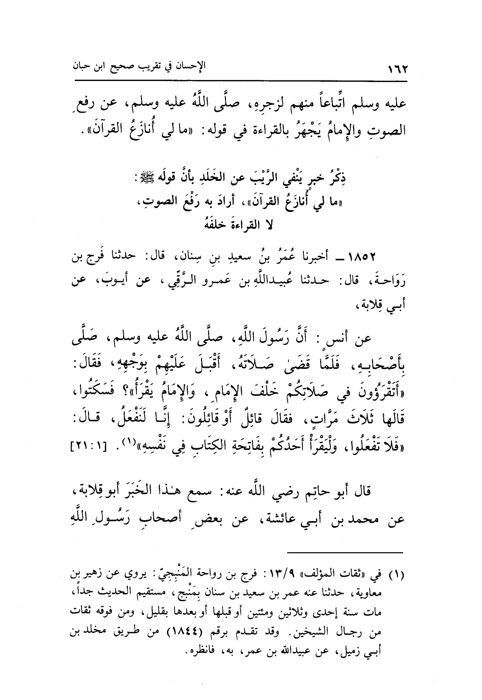 عَنْ أَنَسٍ: أَنَّ رَسُولَ اللَّهِ صَلَّى اللَّهُ عَلَيْهِ وَسَلَّمَ، صَلَّى بأصحابه، فلما قضى صلاته، أقبل علهيم بوجهه، فقال: "أتقرؤون فِي صَلَاتِكُمْ خَلْفَ الْإِمَامِ، وَالْإِمَامُ يَقْرَأُ"؟ فَسَكَتُوا، قَالَهَا ثَلَاثَ مَرَّاتٍ، فَقَالَ قَائِلٌ أَوْ قَائِلُونَ: إِنَّا لَنَفْعَلُ، قَالَ: "فَلَا تَفْعَلُوا، وَلْيَقْرَأْ أَحَدُكُمْ بِفَاتِحَةِ الْكِتَابِ فِي نَفْسِهِ" 1. [1: 21]
