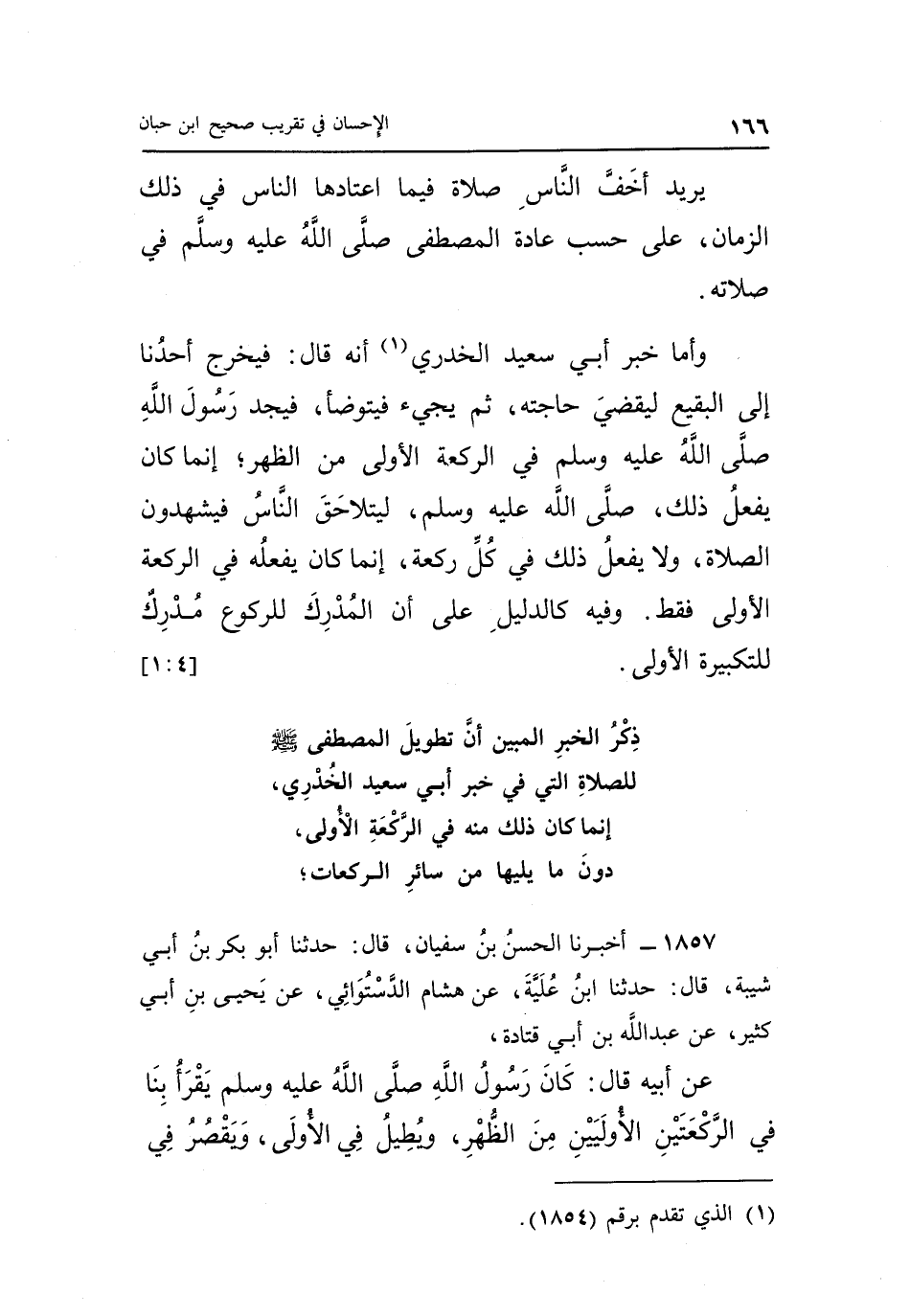 ذِكْرُ الْخَبَرِ الْمُبَيِّنِ أَنَّ تَطْوِيلَ الْمُصْطَفَى صَلَّى اللَّهُ عَلَيْهِ وَسَلَّمَ لِلصَّلَاةِ الَّتِي فِي خَبَرِ أَبِي سَعِيدٍ الْخُدْرِيِّ إِنَّمَا كَانَ ذَلِكَ مِنْهُ فِي الرَّكْعَةِ الْأُولَى دُونَ مَا يَلِيهَا مِنْ سَائِرِ الرَّكَعَاتِ