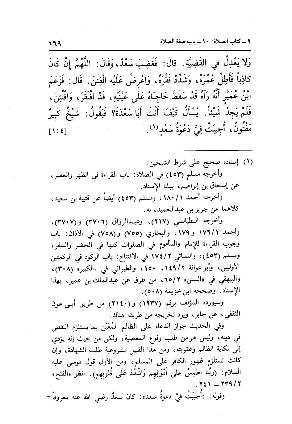 وَلَا يَعْدِلُ فِي الْقَضِيَّةِ. قَالَ: فَغَضِبَ سَعْدٌ، وَقَالَ: اللَّهُمَّ إِنْ كَانَ كَاذِبًا فَأَطِلْ عُمْرَهُ، وَشَدِّدْ فَقْرَهُ، وَاعْرِضْ عَلَيْهِ الْفِتَنَ. قَالَ: فَزَعَمَ بن عُمَيْرٍ أَنَّهُ رَآهُ قَدْ سَقَطَ حَاجِبَاهُ عَلَى عَيْنَيْهِ، قَدِ افْتَقَرَ، وَافْتُتِنَ، فَلَمْ يَجِدْ شَيْئًا. يُسْأَلُ كَيْفَ أَنْتَ أَبَا سَعْدَةَ؟ فَيَقُولُ: شَيْخٌ كبير مفتون، أجيبت في دعوة سعد1. [4: 1]