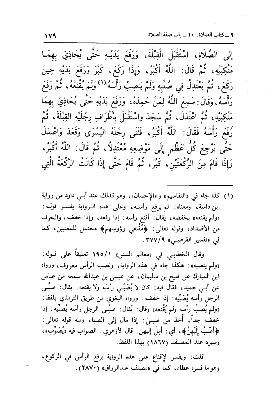 وقال الخطابي في "معالم السنن" 1/195 تعليقا على قوله: "ولم ينصبه":هكذا جاء في هذه الرواية، ونصب الرأس معروف، ورواه ابن المبارك عن فليح بن سليمان، عن عيسى بن عبد الله سمعه من عباس عن أبي حميد، فقال فيه: كان لا يصبي رأسه ولا يقنعه. يقال: صبى الرجل رأسه يصبيه: إذا خفضه. ورواه البغوي من طريق الترمذي بلفظ: "ولم يصب رأسه ولم يقنعه" وقال: يقال: صبى الرجل رأسه يصيبه: إذا خفضه جدا، أخذ من صبى: إذا مال إلى الصبا، ومنه قوله تعالى: {أَصْبُ إِلَيْهِنَّ} ، أي: أمل إليهن. قال الأزهري: الصواب فيه "يصوب"، وسيرد عند المصنف "1867" بهذا اللفظ.