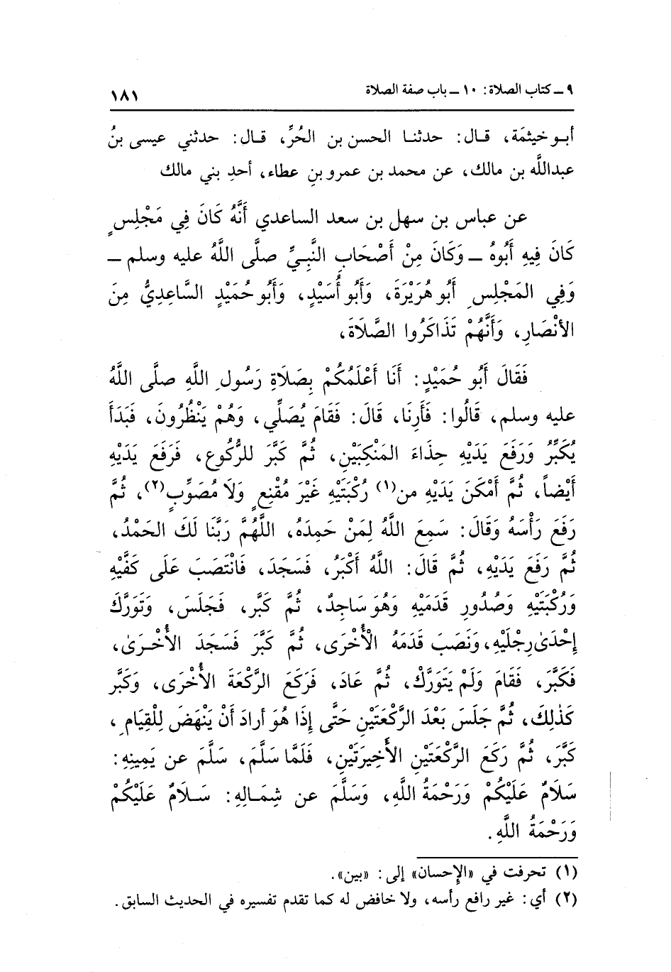فَقَالَ أَبُو حُمَيْدٍ أَنَا أَعْلَمُكُمْ بِصَلَاةِ رَسُولِ اللَّهِ صَلَّى اللَّهُ عَلَيْهِ وَسَلَّمَ قَالُوا فَأَرِنَا قَالَ فَقَامَ يُصَلِّي وَهُمْ يَنْظُرُونَ فَبَدَأَ يُكَبِّرُ وَرَفَعَ يَدَيْهِ حِذَاءَ الْمَنْكِبَيْنِ ثُمَّ كَبَّرَ لِلرُّكُوعِ فَرَفَعَ يَدَيْهِ أَيْضًا ثم أمكن يديه1 من ركبته غَيْرَ مُقَنِّعٍ وَلَا مُصَوِّبٍ2 ثُمَّ رَفَعَ رَأْسَهُ وَقَالَ سَمِعَ اللَّهُ لِمَنْ حَمِدَهُ اللَّهُمَّ رَبَّنَا لَكَ الْحَمْدُ ثُمَّ رَفَعَ يَدَيْهِ ثُمَّ قَالَ الله أكبر فسجد فانتصب على كفيه وركبته وَصُدُورِ قَدَمَيْهِ وَهُوَ سَاجِدٌ ثُمَّ كَبَّرَ فَجَلَسَ وَتَوَرَّكَ إِحْدَى رِجْلَيْهِ وَنَصَبَ قَدَمَهُ الْأُخْرَى ثُمَّ كبر فجد الْأُخْرَى فَكَبَّرَ فَقَامَ وَلَمْ يَتَوَرَّكْ ثُمَّ عَادَ فَرَكَعَ الرَّكْعَةَ الْأُخْرَى وَكَبَّرَ كَذَلِكَ ثُمَّ جَلَسَ بَعْدَ الرَّكْعَتَيْنِ حَتَّى إِذَا هُوَ أَرَادَ أَنْ يَنْهَضَ لِلْقِيَامِ كَبَّرَ ثُمَّ رَكَعَ الرَّكْعَتَيْنِ الْأَخِيرَتَيْنِ فَلَمَّا سَلَّمَ سَلَّمَ عَنْ يَمِينِهِ: "سَلَامٌ عَلَيْكُمْ وَرَحْمَةُ اللَّهِ" وَسَلَّمَ عَنْ شِمَالِهِ: "سَلَامٌ عَلَيْكُمْ ورحمة الله".