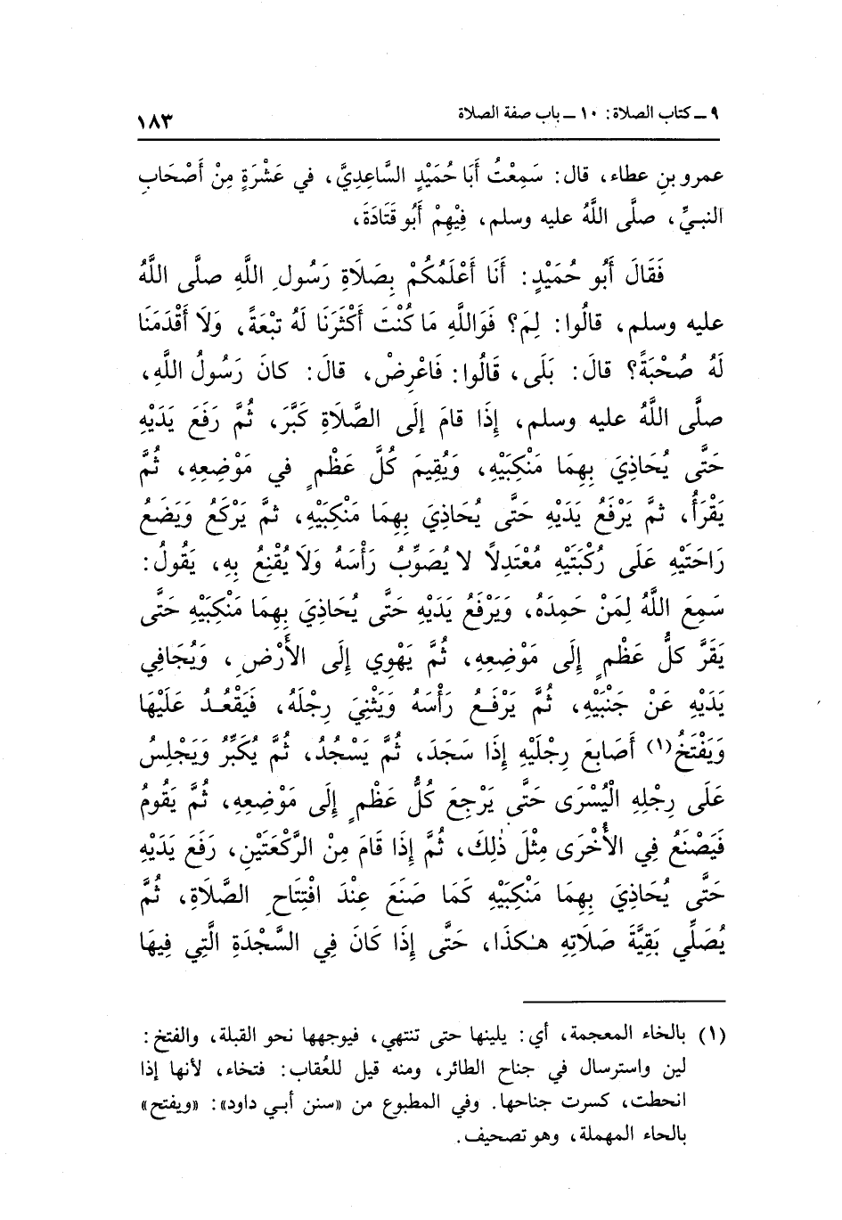 أَبُو حُمَيْدٍ أَنَا أَعْلَمُكُمْ بِصَلَاةِ رَسُولِ اللَّهِ صَلَّى اللَّهُ عَلَيْهِ وَسَلَّمَ قَالُوا لِمَ فَوَاللَّهِ مَا كُنْتَ أَكْثَرَنَا لَهُ تَبَعَةً وَلَا أَقْدَمَنَا لَهُ صُحْبَةً قَالَ بَلَى قَالُوا فَاعْرِضْ قَالَ كَانَ رَسُولُ اللَّهِ صَلَّى اللَّهُ عَلَيْهِ وَسَلَّمَ إِذَا قَامَ إِلَى الصَّلَاةِ كَبَّرَ ثُمَّ رَفَعَ يَدَيْهِ حَتَّى يُحَاذِيَ بِهِمَا مَنْكِبَيْهِ وَيُقِيمُ كُلَّ عَظْمٍ فِي مَوْضِعِهِ ثُمَّ يَقْرَأُ ثُمَّ يَرْفَعُ يَدَيْهِ حَتَّى يُحَاذِيَ بِهِمَا مَنْكِبَيْهِ ثُمَّ يَرْكَعُ وَيَضَعُ رَاحَتَيْهِ عَلَى رُكْبَتَيْهِ مُعْتَدِلًا لَا يُصَوِّبُ رَأْسَهُ وَلَا يَقْنَعْ بِهِ يَقُولُ: "سَمِعَ اللَّهُ لِمَنْ حَمِدَهُ" وَيَرْفَعُ يَدَيْهِ حَتَّى يُحَاذِيَ بِهِمَا مَنْكِبَيْهِ حَتَّى يَقَرَّ كُلُّ عَظْمٍ إِلَى مَوْضِعِهِ ثُمَّ يَهْوِي إِلَى الْأَرْضِ وَيُجَافِي يَدَيْهِ عَنْ جَنْبَيْهِ ثُمَّ يَرْفَعُ رَأْسَهُ وَيَثْنِي رِجْلَهُ فَيَقْعُدُ عَلَيْهَا وَيَفْتَخُ1 أَصَابِعَ رِجْلَيْهِ إِذَا سَجَدَ ثُمَّ يَسْجُدُ ثُمَّ يُكَبِّرُ وَيَجْلِسُ عَلَى رِجْلِهِ الْيُسْرَى حَتَّى يَرْجِعَ كُلُّ عَظْمٍ إِلَى مَوْضِعِهِ ثُمَّ يَقُومُ فَيَصْنَعُ فِي الْأُخْرَى مِثْلَ ذَلِكَ ثُمَّ إِذَا قَامَ مِنَ الرَّكْعَتَيْنِ رَفَعَ يَدَيْهِ حَتَّى يُحَاذِيَ بِهِمَا مَنْكِبَيْهِ كَمَا صَنَعَ عِنْدَ افْتِتَاحِ الصَّلَاةِ ثُمَّ يُصَلِّي بَقِيَّةَ صَلَاتِهِ هَكَذَا حَتَّى إذا كان في السجدة التي فيها