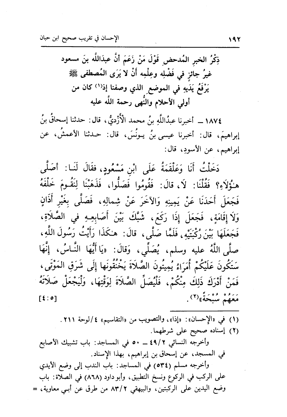 دخلت أنا وعلقمة على بن مَسْعُودٍ فَقَالَ لَنَا أَصَلَّى هَؤُلَاءِ فَقُلْنَا لَا قَالَ فَقُومُوا فَصَلُّوا فَذَهَبْنَا لِنَقُومَ خَلْفَهُ فَجَعَلَ أَحَدَنَا عَنْ يَمِينِهِ وَالْآخَرَ عَنْ شِمَالِهِ فَصَلَّى بِغَيْرِ أَذَانٍ وَلَا إِقَامَةٍ فَجَعَلَ إِذَا رَكَعَ شبك بين أصبعه فِي الصَّلَاةِ فَجَعَلَهَا بَيْنَ رُكْبَتَيْهِ فَلَمَّا صَلَّى قَالَ هَكَذَا رَأَيْتُ رَسُولَ اللَّهِ صَلَّى اللَّهُ عَلَيْهِ وَسَلَّمَ يُصَلِّي وَقَالَ: "يَا أَيُّهَا النَّاسُ إِنَّهَا سَتَكُونُ عَلَيْكُمْ أُمَرَاءُ يُمِيتُونَ الصَّلَاةَ يَخْنُقُونَهَا إِلَى شَرَقِ الْمَوْتَى فَمَنْ أَدْرَكَ ذَلِكَ مِنْكُمْ فَلْيُصَلِّ الصَّلَاةَ لِوَقْتِهَا وَلْيَجْعَلْ صَلَاتَهُ مَعَهُمْ سُبْحَةً" 2. [5: 4]