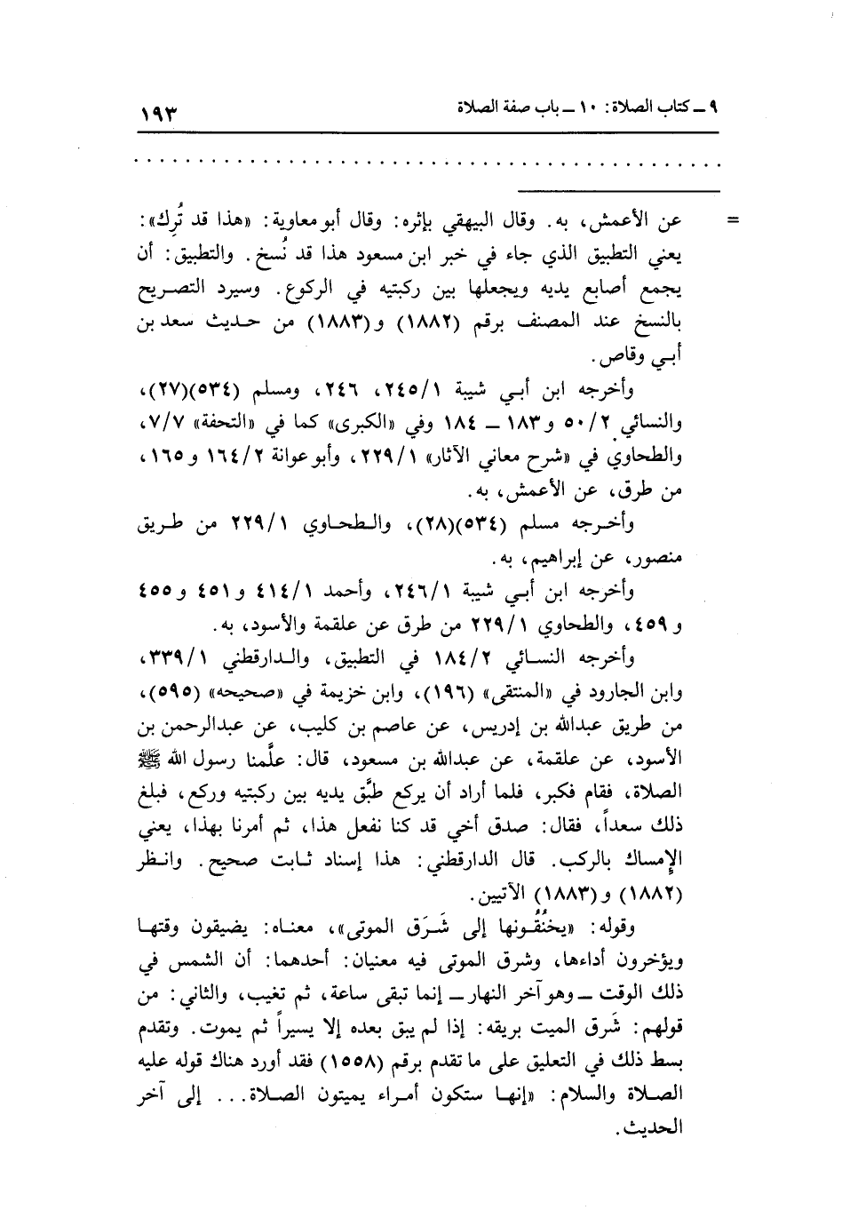 = عن الأعمش، به. وقال البيهقي بإثره: وقال أبو معاوية: هذا قد ترك: يعني التطبيق الذي جاء في خبر ابن مسعود هذا قد نسخ. والتطبيق: أن يجمع أصابع يديه ويجعلها بين ركبتيه في الركوع، وسيرد التصريح بالنسخ عند المصنف برقم "1882" و "1883" من حديث سعد بن أبي وقاص.