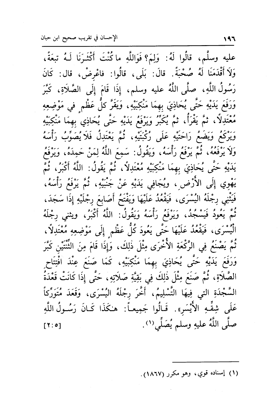 عَلَيْهِ وَسَلَّمَ قَالُوا لَهُ وَلِمَ فَوَاللَّهِ مَا كُنْتَ أَكْثَرَنَا لَهُ تَبَعَةً وَلَا أَقْدَمَنَا لَهُ صُحْبَةً قَالَ بَلَى قَالُوا فَاعْرِضْ قَالَ كَانَ رَسُولُ اللَّهِ صَلَّى اللَّهُ عَلَيْهِ وسلم إذا قَامَ إِلَى الصَّلَاةِ كَبَّرَ وَرَفَعَ يَدَيْهِ حَتَّى يُحَاذِيَ بِهِمَا مَنْكِبَيْهِ وَيَقِرَّ كُلُّ عَظْمٍ فِي مَوْضِعِهِ مُعْتَدِلًا ثُمَّ يَقْرَأُ ثُمَّ يُكَبِّرُ وَيَرْفَعُ يَدَيْهِ حَتَّى يُحَاذِيَ بِهِمَا مَنْكِبَيْهِ وَيَرْكَعُ وَيَضَعُ رَاحَتَيْهِ عَلَى رُكْبَتَيْهِ ثُمَّ يَعْتَدِلُ فَلَا يُصَوِّبُ رَأْسَهُ وَلَا يَرْفَعُهُ ثُمَّ يَرْفَعُ رَأْسَهُ وَيَقُولُ سَمِعَ اللَّهُ لِمَنْ حَمِدَهُ وَيَرْفَعُ يَدَيْهِ حَتَّى يُحَاذِيَ بِهِمَا مَنْكِبَيْهِ مُعْتَدِلًا ثُمَّ يَقُولُ اللَّهُ أَكْبَرُ ثُمَّ يَهْوِي إِلَى الْأَرْضِ وَيُجَافِي يَدَيْهِ عَنْ جَنْبَيْهِ ثُمَّ يَرْفَعُ رَأْسَهُ فَيَثْنِي رِجْلَهُ الْيُسْرَى فَيَقْعُدُ عَلَيْهَا وَيَفْتَحُ أَصَابِعَ رِجْلَيْهِ إِذَا سَجَدَ ثُمَّ يَعُودُ فَيَسْجُدُ وَيَرْفَعُ رَأْسَهُ وَيَقُولُ اللَّهُ أَكْبَرُ وَيَثْنِي رِجْلَهُ الْيُسْرَى فَيَقْعُدُ عَلَيْهَا حَتَّى يَعُودَ كُلُّ عَظْمٍ إِلَى مَوْضِعِهِ مُعْتَدِلًا ثُمَّ يَصْنَعُ فِي الرَّكْعَةِ الْأُخْرَى مِثْلَ ذَلِكَ وَإِذَا قَامَ مِنَ الثِّنْتَيْنِ كَبَّرَ وَرَفَعَ يَدَيْهِ حَتَّى يُحَاذِيَ بِهِمَا مَنْكِبَيْهِ كَمَا صَنَعَ عِنْدَ افْتِتَاحِ الصَّلَاةِ ثُمَّ صَنَعَ مِثْلَ ذَلِكَ فِي بَقِيَّةِ صَلَاتِهِ حَتَّى إِذَا كَانَتْ قَعْدَةُ السَّجْدَةِ الَّتِي فِيهَا التَّسْلِيمُ أَخَّرَ رِجْلَهُ الْيُسْرَى وَقَعَدَ مُتَوَرِّكًا عَلَى شِقِّهِ الْأَيْسَرِ قَالُوا جَمِيعًا هَكَذَا كَانَ رَسُولُ اللَّهِ صَلَّى اللَّهُ عَلَيْهِ وَسَلَّمَ يصلي 1. [5: 2]