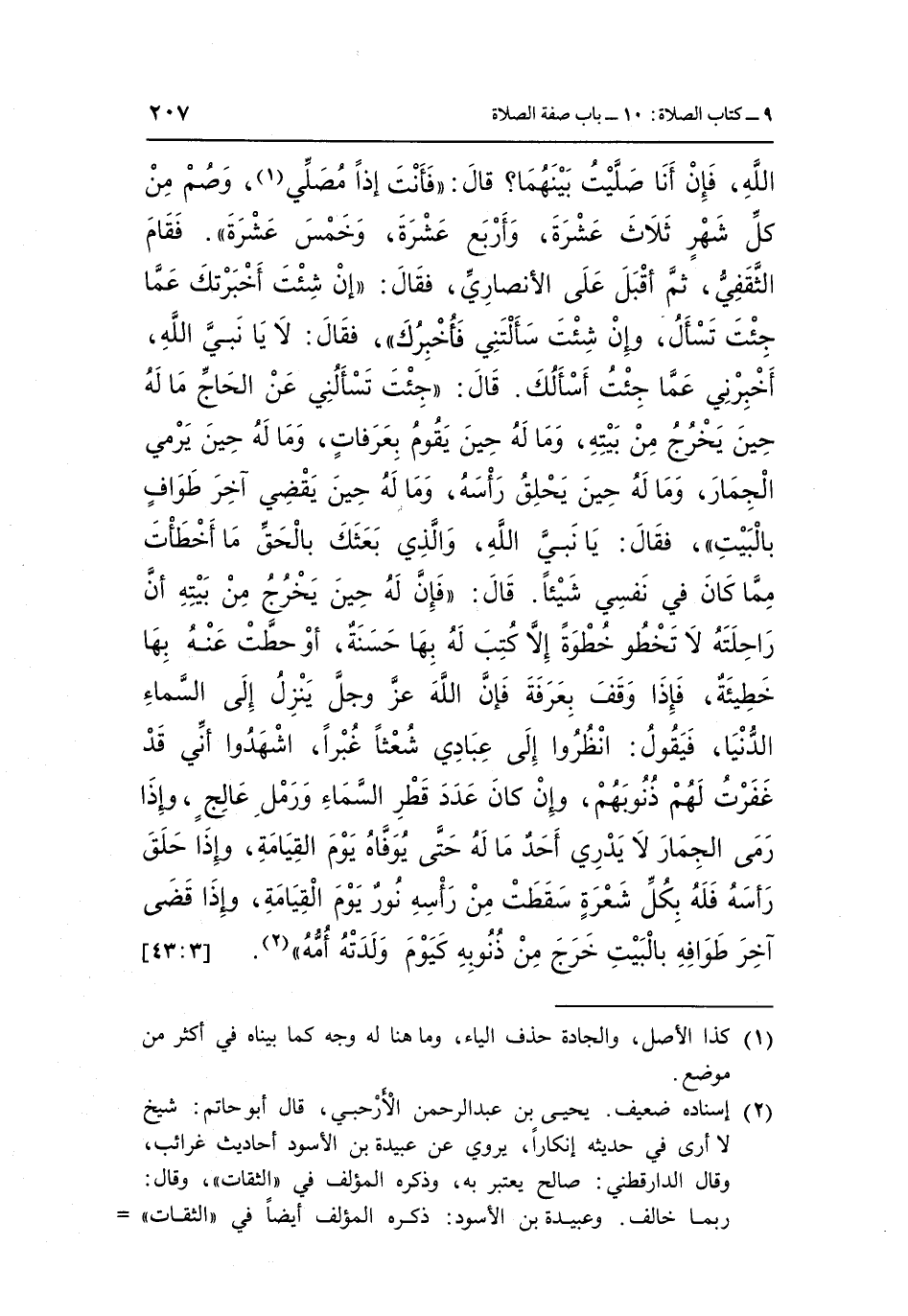 اللَّهِ فَإِنْ أَنَا صَلَّيْتُ بَيْنَهُمَا قَالَ: "فَأَنْتَ إِذًا مُصَلِّي 1وَصُمْ مِنْ كُلِّ شَهْرٍ ثَلَاثَ عَشْرَةَ وَأَرْبَعَ عَشْرَةَ وَخَمْسَ عَشْرَةَ" فَقَامَ الثَّقَفِيُّ ثُمَّ أَقْبَلَ عَلَى الْأَنْصَارِيِّ فَقَالَ: "إِنْ شِئْتَ أَخْبَرْتُكَ عَمَّا جِئْتَ تَسْأَلُ وَإِنْ شِئْتَ سَأَلْتَنِي فَأُخْبِرْكَ" فَقَالَ لَا يَا نَبِيَّ اللَّهِ أَخْبَرَنِي عَمَّا جِئْتُ أَسْأَلُكَ قَالَ: "جِئْتَ تَسْأَلُنِي عَنِ الْحَاجِّ مَا لَهُ حِينَ يَخْرُجُ مِنْ بَيْتِهِ وَمَا لَهُ حِينَ يَقُومُ بِعَرَفَاتٍ وَمَا لَهُ حِينَ يَرْمِي الْجِمَارَ وَمَا لَهُ حِينَ يَحْلِقُ رَأْسَهُ وَمَا لَهُ حِينَ يَقْضِي آخِرَ طَوَافٍ بِالْبَيْتِ" فَقَالَ يَا نَبِيَّ اللَّهِ وَالَّذِي بَعَثَكَ بِالْحَقِّ مَا أَخْطَأْتَ مِمَّا كَانَ فِي نَفْسِي شَيْئًا قَالَ: "فَإِنَّ لَهُ حِينَ يَخْرُجُ مِنْ بَيْتِهِ أَنَّ رَاحِلَتَهُ لَا تَخْطُو خُطْوَةً إِلَّا كُتِبَ لَهُ بِهَا حَسَنَةٌ أَوْ حُطَّتْ عَنْهُ بِهَا خَطِيئَةٌ فَإِذَا وَقَفَ بِعَرَفَةَ فَإِنَّ اللَّهَ عَزَّ وَجَلَّ يَنْزِلُ إِلَى السَّمَاءِ الدُّنْيَا فَيَقُولُ انْظُرُوا إِلَى عِبَادِي شُعْثًا غُبْرًا اشْهَدُوا أَنِّي قَدْ غَفَرْتُ لَهُمْ ذُنُوبَهُمْ وَإِنْ كَانَ عَدَدَ قَطْرِ السَّمَاءِ وَرَمْلِ عَالِجٍ وَإِذَا رَمَى الْجِمَارَ لا يدري أحد له مَا لَهُ حَتَّى يُوَفَّاهُ يَوْمَ الْقِيَامَةِ وَإِذَا حَلَقَ رَأْسَهُ فَلَهُ بِكُلِّ شَعْرَةٍ سَقَطَتْ مِنْ رَأْسِهِ نُورٌ يَوْمَ الْقِيَامَةِ وَإِذَا قَضَى آخِرَ طَوَافِهِ بِالْبَيْتِ خَرَجَ مِنْ ذُنُوبِهِ كَيَوْمِ وَلَدَتْهُ أمه"2.