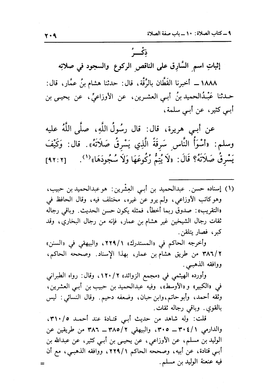 1888 - أَخْبَرَنَا الْقَطَّانُ بِالرَّقَّةِ قَالَ: حَدَّثَنَا هِشَامُ بْنُ عَمَّارٍ قَالَ: حَدَّثَنَا عَبْدُ الْحَمِيدِ بْنُ أَبِي الْعِشْرِينَ عَنِ الْأَوْزَاعِيُّ عَنْ يَحْيَى بْنِ أَبِي كَثِيرٍ عَنْ أَبِي سَلَمَةَ،