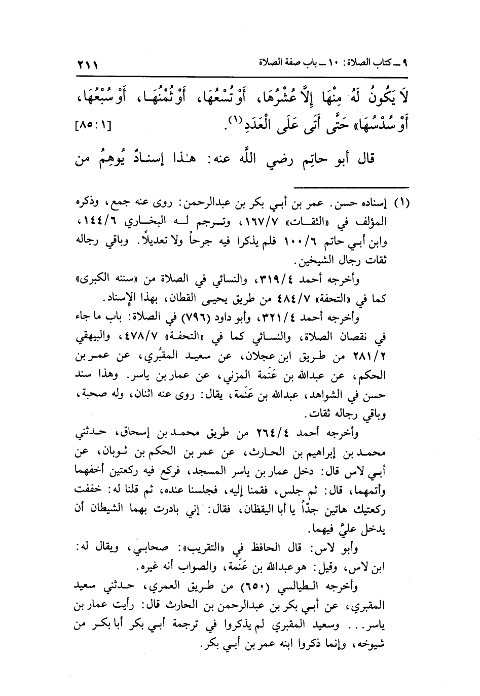 وأخرجه أحمد 4/321، وأبو داود "796" في الصلاة: باب ما جاء في نقصان الصلاة، والنسائي كما في التحفة 7/478، والبيهقي 2/281 من طريق ابن عجلان، عن سعيد المقبري، عن عمر بن الحكم، عن عبد الله بن عنمة المزني، عن عمار بن ياسر. وهذا سند حسن في الشواهد، عبد الله بن عنمة، يقال: روى عنه اثنان، وله صحبة، وباقي رجاله ثقات.