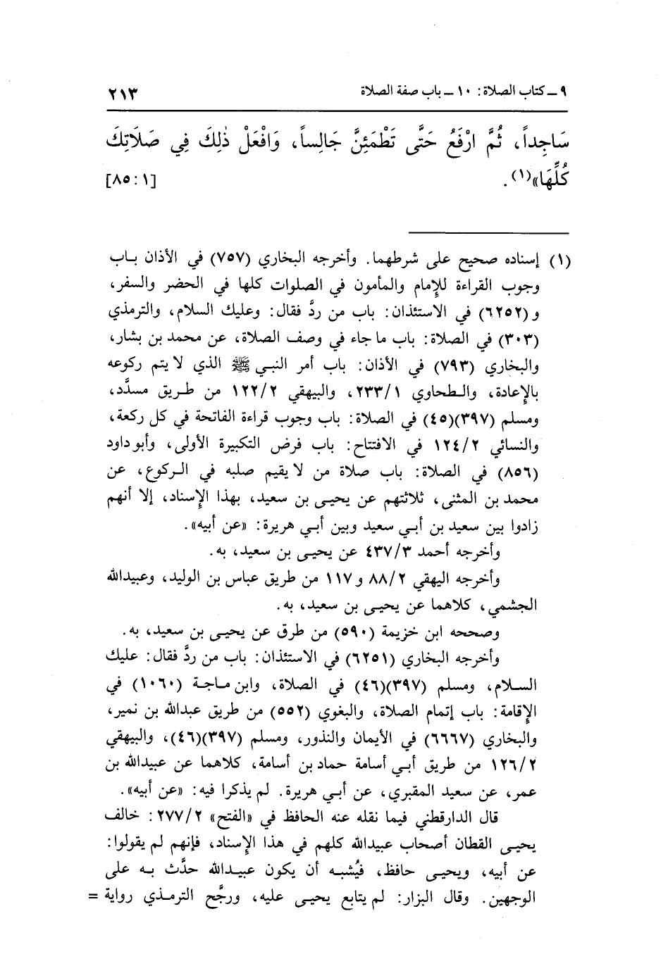 1 إسناده صحيح على شرطهما. وأخرجه البخاري "757" في الأذان باب وجوب القراءة للإمام والمأمون في الصلوات كلها في الحضر والسفر، و "6252" في الاستئذان: باب من رد فقال: وعليك السلام، والترمذي "303" في الصلاة: باب ما جاء في وصف الصلاة، وابن خزيمة "590"، عن محمد بن بشار، والبخاري "793" في الأذان: باب أمر النبي صلى الله عليه وسلم الذي لا يتم ركوعه بالإعادة، والطحاوي 1/233، والبيهقي 2/122 من طريق مسدد، ومسلم "397" "45" في الصلاة: باب وجوب قراءة الفاتحة في كل ركعة، والنسائي 2/124 في الافتتاح: باب فرض التكبيرة الأولى، وأبو داود "856" في الصلاة: باب صلاة من لا يقيم صلبه في الركوع، عن محمد بن المثنى، ثلاثتهم عن يحيى بن سعيد، بهذا الإسناد. إلا أنهم زادوا بين سعيد بن أبي سعيد وبين أبي هريرة: عن أبيه.