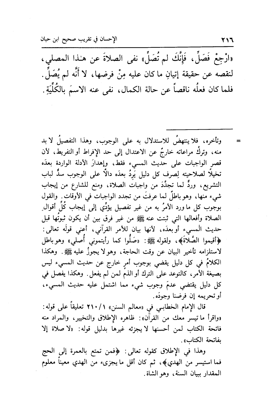 = وتأخره، فلا ينتهض للاستدلال به على الوجوب، وهذا التفصيل لابد منه، وترك مراعاته خارج عن الاعتدال إلى حد الإفراظ أو التفريط، لأن قصر الواجبات على حديث المسيء فقط، وإهدار الأدلة الواردة بعده تخيلاً لصلاحيته لصرف كل دليل يرد بعده دالاً على الوجوب سد لباب التشريع، ورد لما تجدد من واجبات الصلاة، ومنع للشارع من إيجاب شيء منها، وهو باطل لما عرفت من تجدد الواجبات في الأوقات. والقول بوجوب كل ما ورد الأمر به من غير تفصيل يؤدي إلى إيجاب كل أقوال الصلاة وأفعالها التي ثبتت عنه صلى الله عليه وسلم من غير فرق بين أن يكون ثبوتها قبل حديث المسيء أو بعده، لأنها بيان للأمر القرآني، أعني قوله تعالى: {أَقِيمُوا الصَّلاةَ} ، ولقوله صلى الله عليه وسلم: "صلوا كما رأيتموني أصلي" وهو باطل لا ستلزامه تأخير البيان عن وقت الحاجة، وهو لا يجوز عليه صلى الله عليه وسلم. وهكذا الكلام في كل دليل يقضي بوجوب أمر خارج عن حديث المسيء ليس بصيغة الأمر، كالتوعد على الترك أو الذم لمن لم يفعل. وهكذا يفصل في كل دليل يقتضي عدم وجوب شيء مما اشتمل عليه حديث المسيء، أو تحريمه إن فرضنا وجوده.