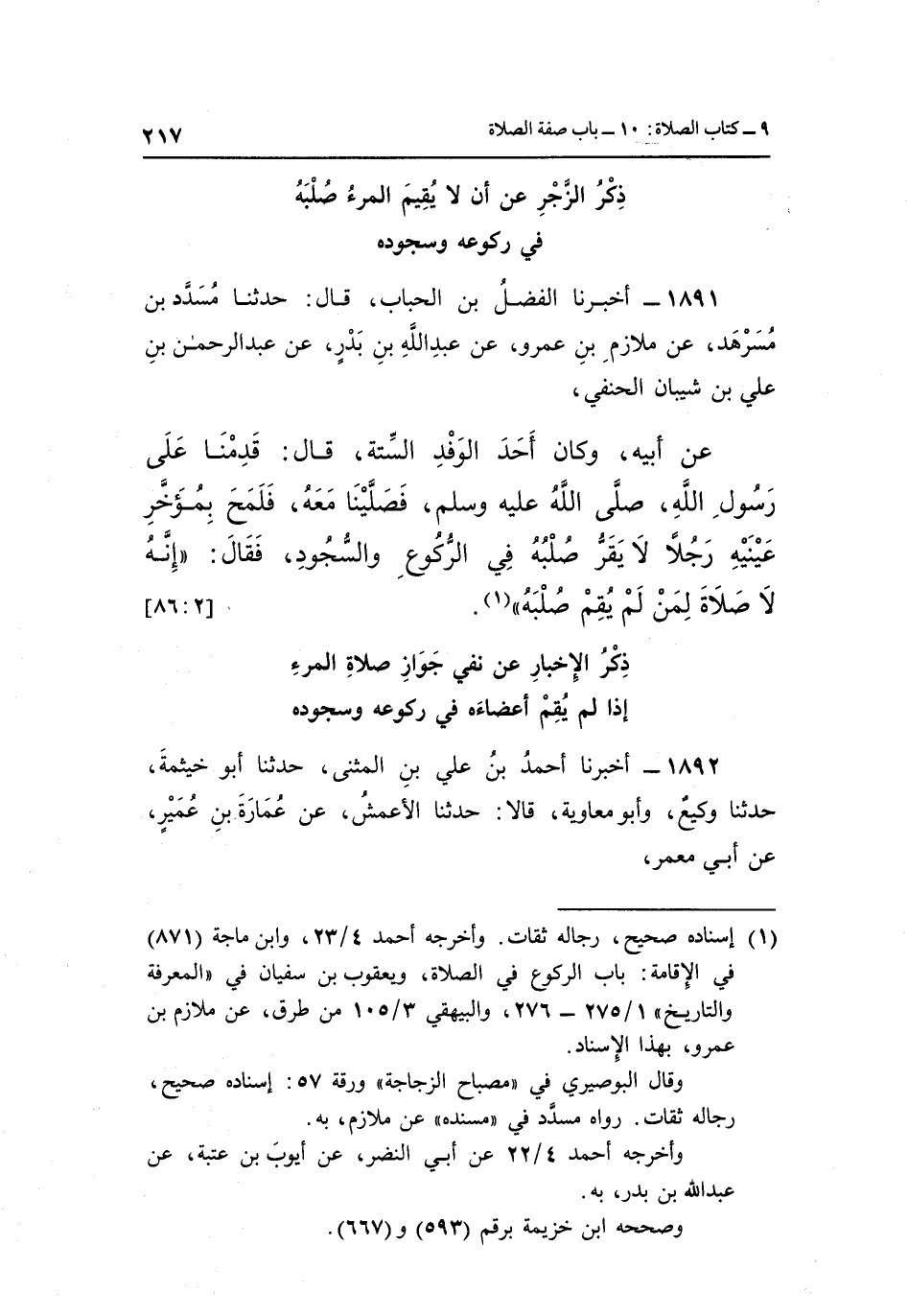 عَنْ أَبِيهِ وَكَانَ أَحَدَ الْوَفْدِ السِّتَّةِ قَالَ قَدِمْنَا عَلَى رَسُولِ اللَّهِ صَلَّى اللَّهُ عَلَيْهِ وَسَلَّمَ فَصَلَّيْنَا مَعَهُ فَلَمَحَ بِمُؤَخَّرِ عَيْنَيْهِ رَجُلًا لَا يُقِرُّ صُلْبَهُ فِي الرُّكُوعِ وَالسُّجُودِ فَقَالَ: "إِنَّهُ لَا صَلَاةَ لِمَنْ لَمْ يقم صلبه" 1. [2: 86]