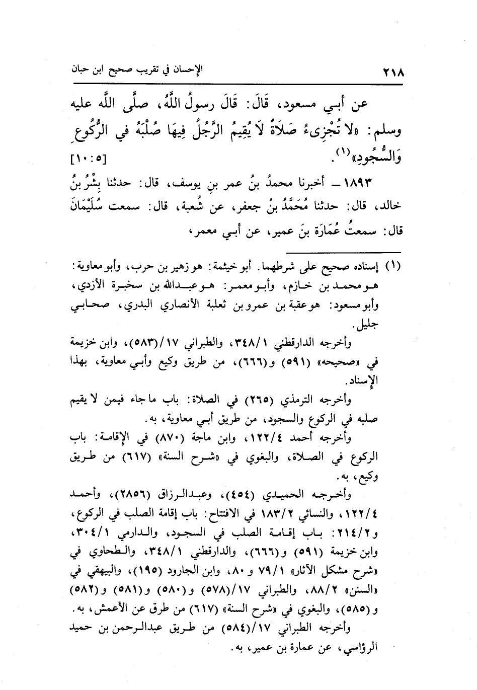 عَنْ أَبِي مَسْعُودٍ قَالَ قَالَ رَسُولُ اللَّهِ صَلَّى اللَّهُ عَلَيْهِ وسلم: "لا تجزىء صَلَاةٌ لَا يُقِيمُ الرَّجُلُ فِيهَا صُلْبَهُ فِي الركوع والسجود" 1. [5: 10]