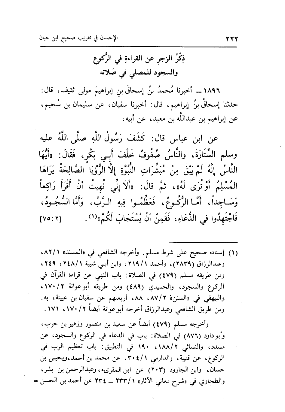 عَنِ بن عَبَّاسٍ قَالَ كَشَفَ رَسُولُ اللَّهِ صَلَّى اللَّهُ عَلَيْهِ وَسَلَّمَ السِّتَارَةَ وَالنَّاسُ صُفُوفٌ خَلْفَ أَبِي بَكْرٍ فَقَالَ: " أَيُّهَا النَّاسُ إِنَّهُ لَمْ يَبْقَ مِنْ مُبَشِّرَاتِ النُّبُوَّةِ إِلَّا الرُّؤْيَا الصَّالِحَةُ يَرَاهَا الْمُسْلِمُ أَوْ تُرَى لَهُ" ثُمَّ قَالَ: "أَلَا إني نهيت أَقْرَأَ رَاكِعًا وَسَاجِدًا أَمَّا الرُّكُوعُ فَعَظِّمُوا فِيهِ الرَّبَّ وَأَمَّا السُّجُودُ فَاجْتَهِدُوا فِي الدُّعَاءِ فَقَمِنٌ أَنْ يُسْتَجَابَ لَكُمْ" 1. [2: 75]