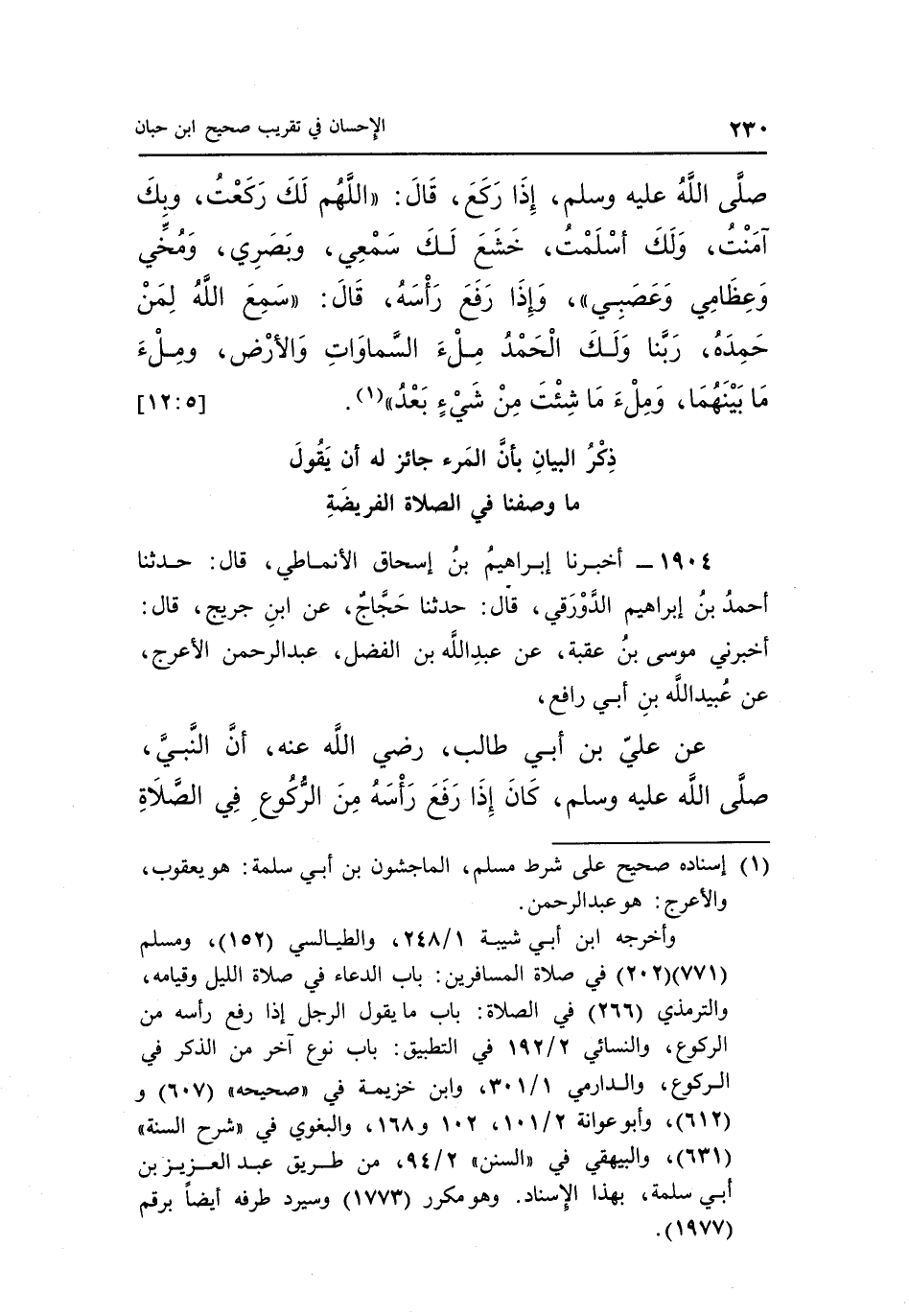 صَلَّى اللَّهُ عَلَيْهِ وَسَلَّمَ إِذَا رَكَعَ قَالَ: "اللَّهُمَّ لَكَ رَكَعْتُ وَبِكَ آمَنْتُ وَلَكَ أَسْلَمْتُ خَشَعَ لَكَ سَمْعِي وَبَصَرِي وَمُخِّي وَعِظَامِي وَعَصَبِي" وَإِذَا رَفَعَ رَأْسَهُ قَالَ: "سَمِعَ اللَّهُ لِمَنْ حَمِدَهُ رَبَّنَا وَلَكَ الْحَمْدُ مِلْءَ السَّمَاوَاتِ وَالْأَرْضِ وَمِلْءَ مَا بَيْنَهُمَا وَمِلْءَ مَا شِئْتَ مِنْ شيء بعد" 1. [5: 12]