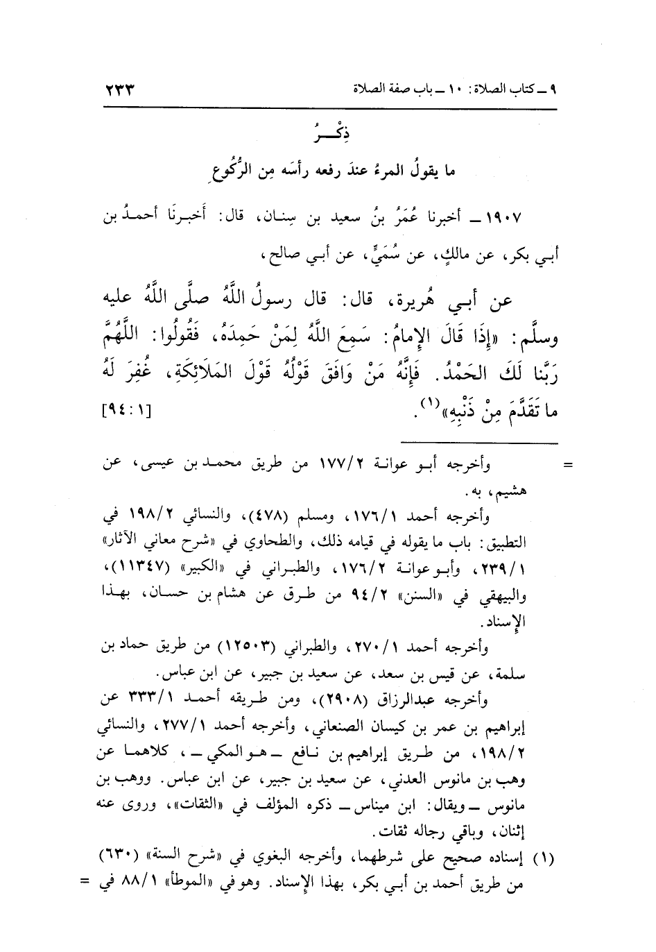 عَنْ أَبِي هُرَيْرَةَ قَالَ قَالَ رَسُولُ اللَّهِ صَلَّى اللَّهُ عَلَيْهِ وَسَلَّمَ: "إِذَا قَالَ الْإِمَامُ سَمِعَ اللَّهُ لِمَنْ حَمِدَهُ فَقُولُوا اللَّهُمَّ رَبَّنَا لَكَ الْحَمْدُ فَإِنَّهُ مَنْ وَافَقَ قَوْلُهُ قَوْلَ الْمَلَائِكَةِ غُفِرَ لَهُ مَا تَقَدَّمَ مِنْ ذَنْبِهِ" 1. [1: 94]