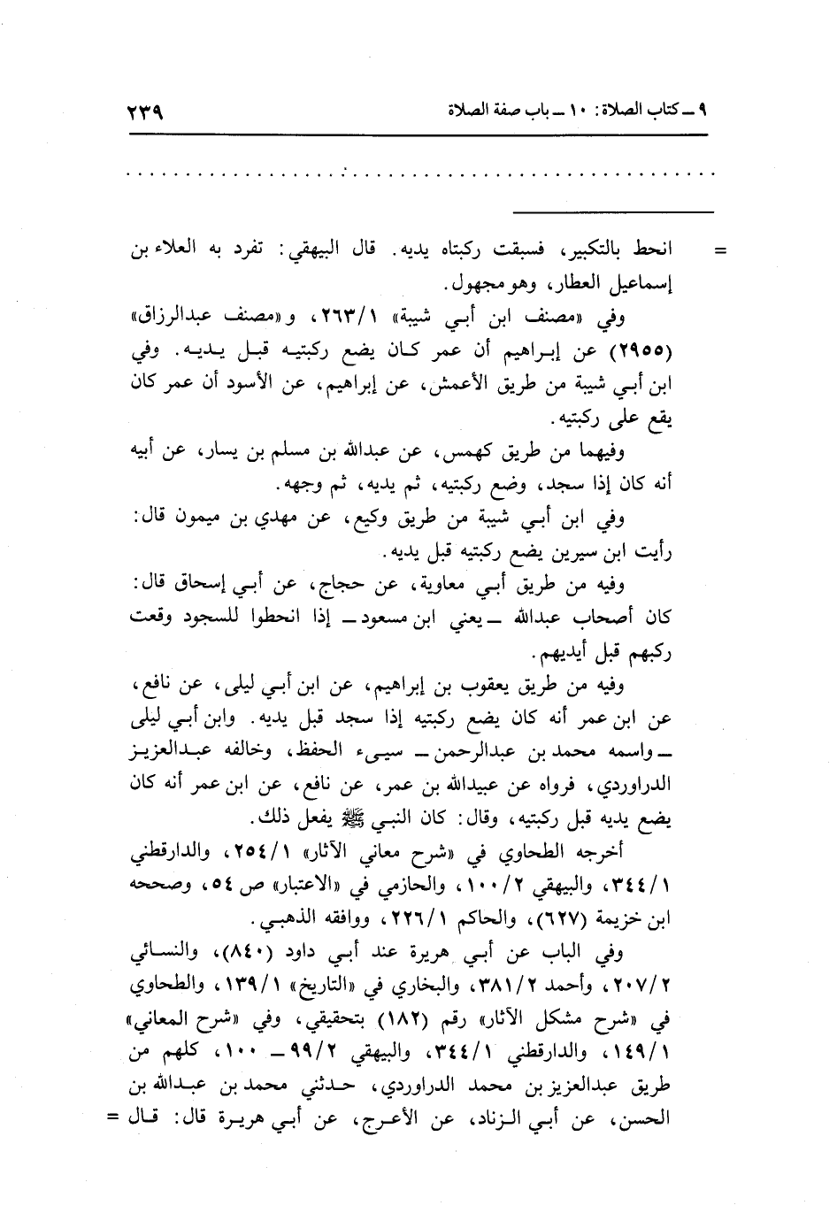 وفيه من طريق يعقوب بن إبراهيم، عن ابن أبي ليلى، عن نافع، عن ابن عمر أنه كان يضع ركبتيه إذا سجد قبل يديه. وابن أبي ليلى –واسمه محمد بن عبد الرحمن- سيئ الحفظ، وخالفه عبد العزيز الداراوردي، فرواه عن عبيد الله بن عمر، عن نافع، عن ابن عمر أنه كان يضع يديه قبل ركبتيه، وقال: كان النبي صلى الله عليه وسلم يفعل ذلك.