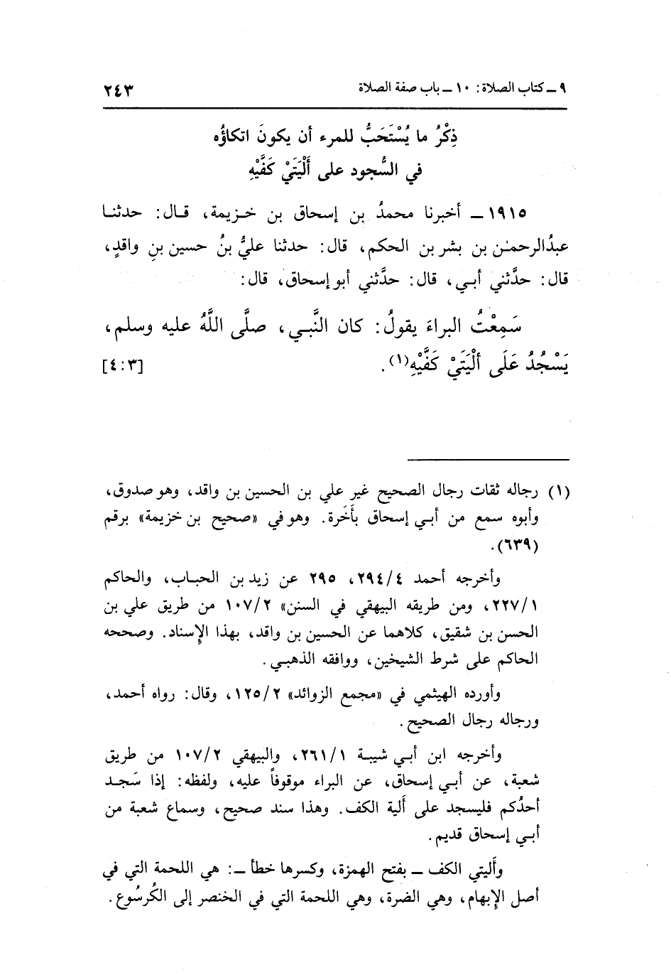 وأخرجه ابن أبي شيبة 1/261،والبيهقي 2/107 من طريق شعبة عن أبي إسحاق، عن البراء موقوفاً عليه، ولفظه: إذا سجد أحدكم فليسجد على ألية الكف. وهذا سند صحيح، وسماع شعبة من أبي إسحاق قديم.
