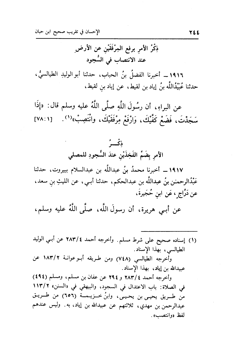 وأخرجه أحمد 4/284و294 عن عفان بن مسلم، ومسلم "494" في الصلاة: باب الاعتدال في السجود، والبيهقي في السنن 2/113 من طريق يحيى بن يحيى، وابن خزيمة "656" من طريق عبد الرحمن بن مهدي، ثلاثتهم عن عبيد الله بن إياد، به. وليس عندهم لفظ وانتصب.