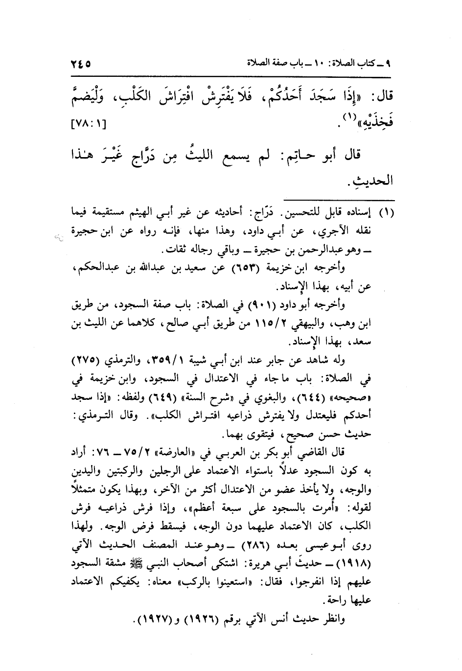 قال القاضي أبو بكر بن العربي في العارضة 2/75-76: أراد به كون السجود عدلاً باستواء الاعتماد على الرجلين والركبتين واليدين والوجه، ولا يأخذ عضو من الاعتدال أكثر من الآخر، وبهذا يكون متمثلاً لقوله: "أمرت بالسجود على سبعة أعظم"، وإذا فرش ذراعيه فرش الكلب، كان الاعتماد عليهما دون الوجه، فيسقط فرض الوجه. ولهذا روى أبو عيسى بعده "286" –وهو عند المصنف الحديث الآتي "1918" - حديث أبي هريرة: اشتكى أصحاب النبي صلى الله عليه وسلم مشقة السجود عليهم إذا انفرجوا، فقال: "استعينوا بالركب" معناه: يكفيكم الاعتماد عليها راحة.