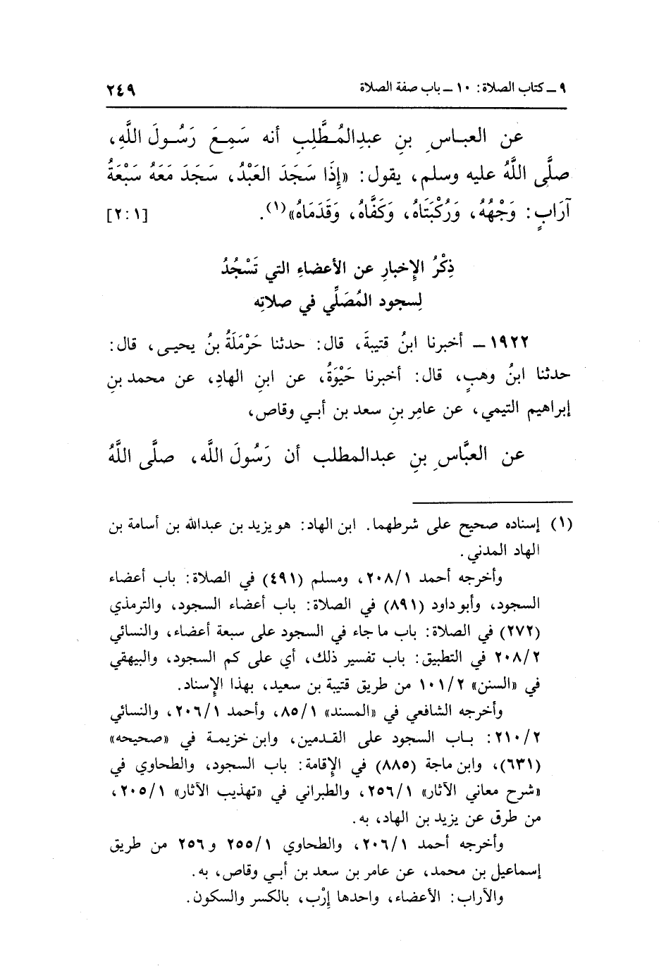 عَنِ الْعَبَّاسِ بْنِ عَبْدِ الْمُطَّلِبِ إِنَّهُ سَمِعَ رَسُولَ اللَّهِ صَلَّى اللَّهُ عَلَيْهِ وسلم يقول: "إِذَا سَجَدَ الْعَبْدُ سَجَدَ مَعَهُ سَبْعَةُ آرَابٍ وجهه وركبتاه وكفاه وقدماه" 1. [1: 2]