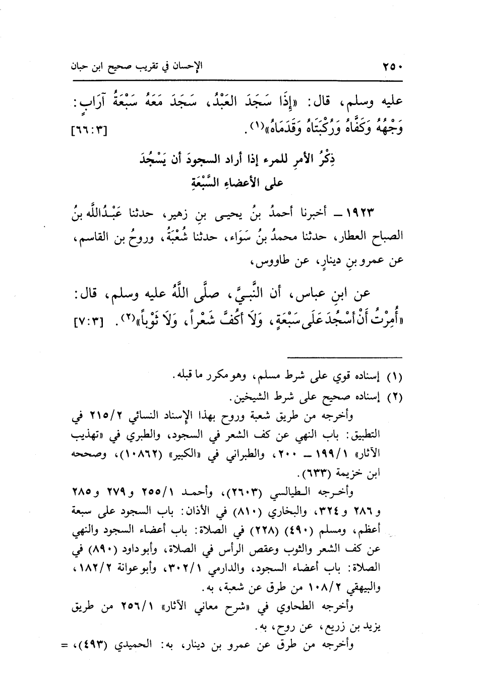 عَنِ بن عَبَّاسٍ أَنَّ النَّبِيَّ صَلَّى اللَّهُ عَلَيْهِ وَسَلَّمَ قَالَ: "أُمِرْتُ أَنْ أَسْجُدَ عَلَى سَبْعَةٍ وَلَا أكف شعرا ولا ثوبا" 2. [3: 7]