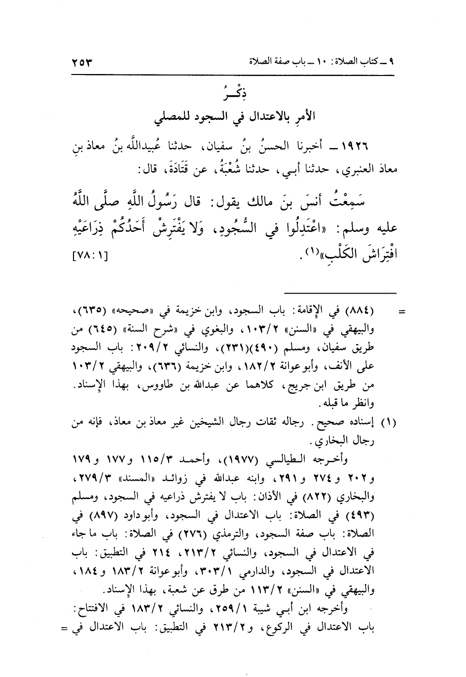 سَمِعْتُ أَنَسَ بْنَ مَالِكٍ يَقُولُ قَالَ رَسُولُ اللَّهِ صَلَّى اللَّهُ عَلَيْهِ وسلم: ا "تدلوا فِي السُّجُودِ وَلَا يَفْتَرِشْ أَحَدُكُمْ ذِرَاعَيْهِ افْتِرَاشَ الكلب" 1. [1: 78]