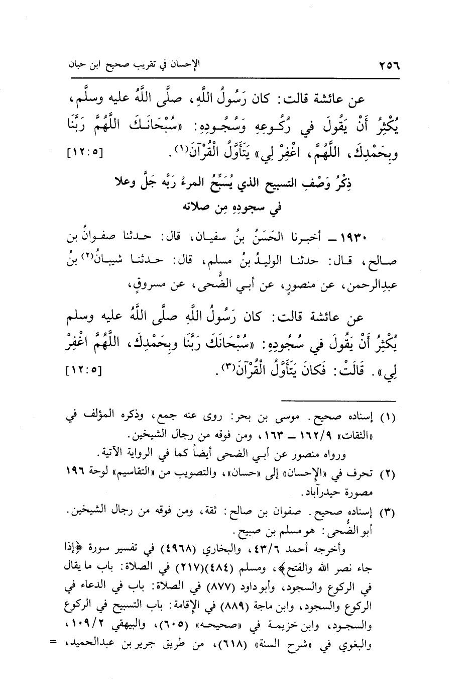 عَنْ عَائِشَةَ قَالَتْ كَانَ رَسُولُ اللَّهِ صَلَّى اللَّهُ عَلَيْهِ وَسَلَّمَ يُكْثِرُ أَنْ يَقُولَ فِي رُكُوعِهِ وَسُجُودِهِ: "سُبْحَانَكَ اللَّهُمَّ رَبَّنَا وَبِحَمْدِكَ اللَّهُمَّ اغفر لي" يتأول القرآن 1. [5: 12]