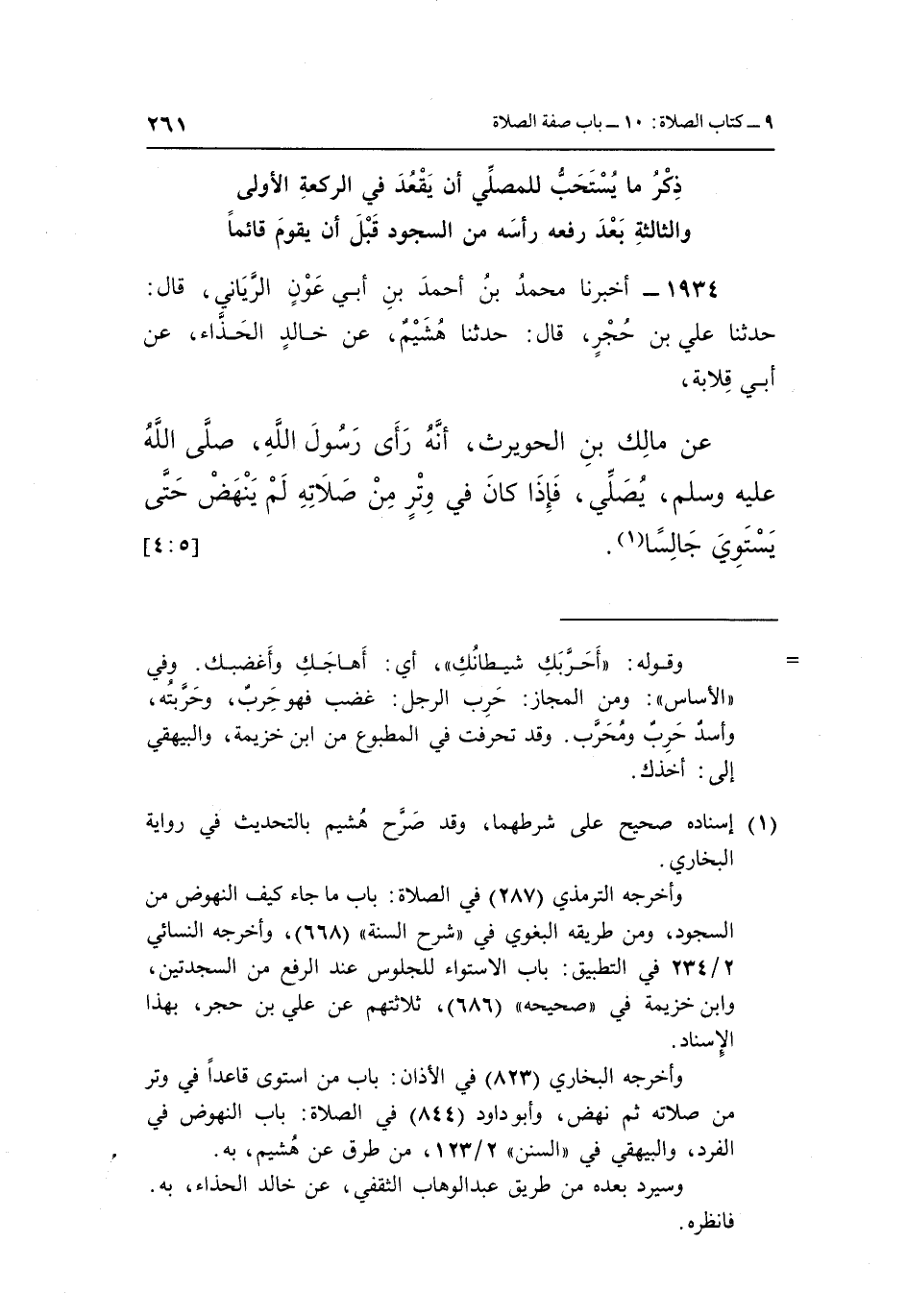 وأخرجه البخاري "823" في الأذان: باب من استوى قاعداً في وتر من صلاته ثم نهض، وأبو داود "844" في الصلاة: باب النهوض في الفرد، والبيهقي في السنن 2/123، من طرق عن هشيم به.