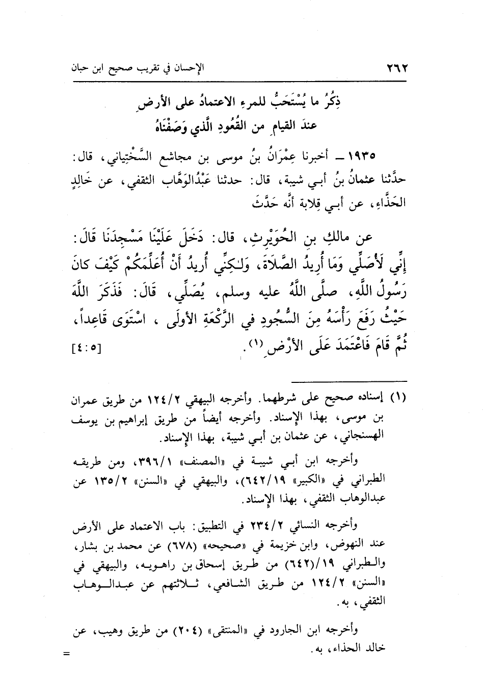 1935 - أَخْبَرَنَا عِمْرَانُ بْنُ مُوسَى بْنِ مُجَاشِعٍ السِّخْتِيَانِيُّ قَالَ: حَدَّثَنَا عُثْمَانُ بْنُ أَبِي شَيْبَةَ قَالَ: حَدَّثَنَا عَبْدُ الْوَهَّابِ الثَّقَفِيُّ عَنْ خَالِدٍ الْحَذَّاءِ عَنْ أَبِي قِلَابَةَ أَنَّهُ حَدَّثَ