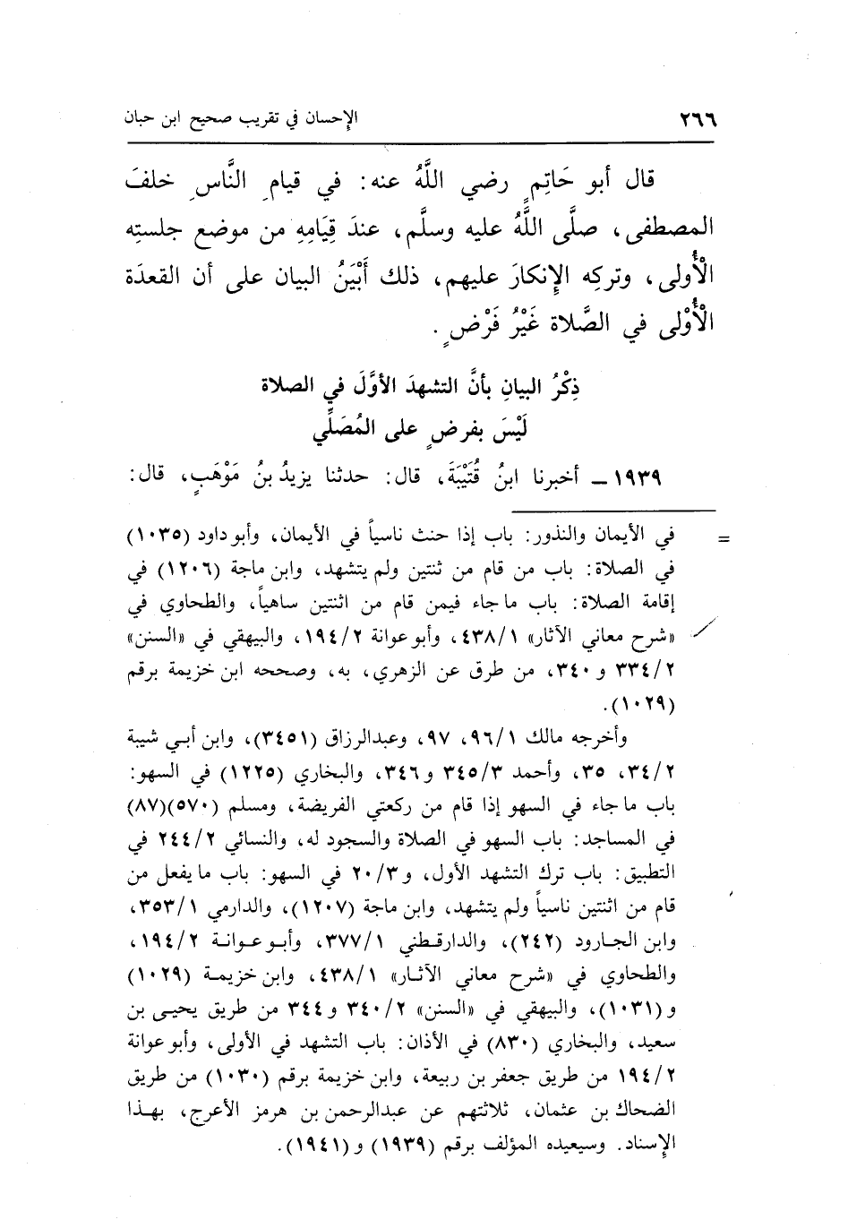 قال أبو حاتم رضى الله تعالى عَنْهُ: فِي قِيَامِ النَّاسِ خَلْفَ الْمُصْطَفَى صَلَّى اللَّهُ عَلَيْهِ وَسَلَّمَ عِنْدَ قِيَامِهِ مِنْ مَوْضِعِ جَلْسَتِهِ الْأُولَى وَتَرْكِهِ الْإِنْكَارَ عَلَيْهِمْ ذَلِكَ أَبْيَنُ الْبَيَانِ عَلَى أَنَّ الْقَعْدَةَ الْأُولَى فِي الصَّلَاةِ غير فرض.