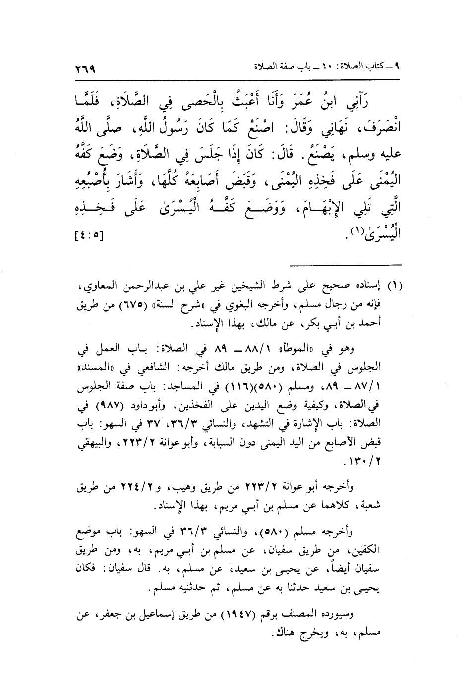 وهو في الموطأ 1/88-89 في الصلاة: باب العمل في الجلوس في الصلاة، ومن طريق مالك أخرجه: الشافعي في المسند 1/87-89، ومسلم "580" "116" في المساجد: باب صفة الجلوس في الصلاة، وكيفية وضع اليدين على الفخذين، وأبو داود "987" في الصلاة: باب الإشارة في التشهد، والنسائي 3/36، 37 في السهو: باب قبض الأصابع من اليد اليمنى دون السبابة، وأبو عوانة 2/223، والبيهقي 2/130.