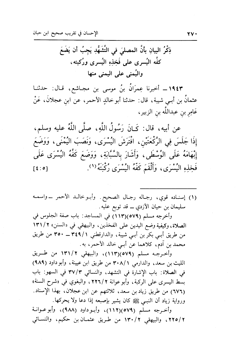 وأخرجه مسلم "579" "113" في المساجد: باب صفة الجلوس في الصلاة، وكيفية وضع الدين على الفخذين، والبيهقيي في السنن 2/131 من طريق أبي بكر بن أبي شيبة، والدارقطني 1/349-350 من طريق محمد بن آدم، كلاهما عن أبي خالد الأحمر، به.