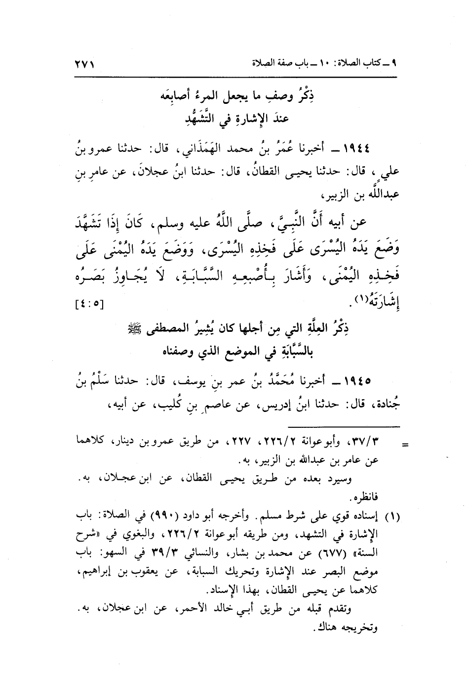 1 إسناده قوي على شرط مسلم. وأخرجه أبو داود "990" في الصلاة: باب الإشارة في التشهد، ومن طريقه أبو عوانة 2/226، والبغوي في شرح السنة "677" عن محمد بن بشار، والنسائي 3/39 في السهو: باب موضع البصر عند الإشارة وتحريك السبابة، عن يعقوب بن إبراهيم، كلاهما عن يحيى القطان، بهذا الإسناد.