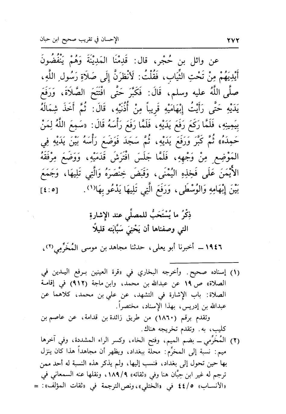 عَنْ وَائِلِ بْنِ حُجْرٍ قَالَ: قَدِمْنَا الْمَدِينَةَ وَهُمْ يَنْفُضُونَ أَيْدِيَهُمْ مِنْ تَحْتِ الثِّيَابِ فَقُلْتُ لَأَنْظُرَنَّ إِلَى صَلَاةِ رَسُولِ اللَّهِ صَلَّى اللَّهُ عَلَيْهِ وَسَلَّمَ قَالَ فَكَبَّرَ حَتَّى افْتَتَحَ الصَّلَاةَ وَرَفَعَ يَدَيْهِ حَتَّى رَأَيْتُ إِبْهَامَيْهِ قَرِيبًا مِنْ أُذُنَيْهِ قَالَ ثُمَّ أَخَذَ شِمَالَهُ بِيَمِينِهِ فَلَمَّا رَكَعَ رَفَعَ يَدَيْهِ فَلَمَّا رَفَعَ رَأْسَهُ قَالَ: "سَمِعَ اللَّهُ لِمَنْ حَمِدَهُ" ثُمَّ كَبَّرَ وَرَفَعَ يَدَيْهِ ثُمَّ سَجَدَ فَوَضَعَ رَأْسَهُ بَيْنَ يَدَيْهِ فِي الْمَوْضِعِ مِنْ وَجْهِهِ فَلَمَّا جَلَسَ افْتَرَشَ قدميه ووضع مرفقه اليمن عَلَى فَخِذِهِ الْيُمْنَى وَقَبَضَ خِنْصَرَهُ وَالَّتِي تَلِيهَا وَجَمَعَ بَيْنَ إِبْهَامِهِ وَالْوُسْطَى وَرَفَعَ الَّتِي تَلِيهَا يدعو بها1. [5: 4]