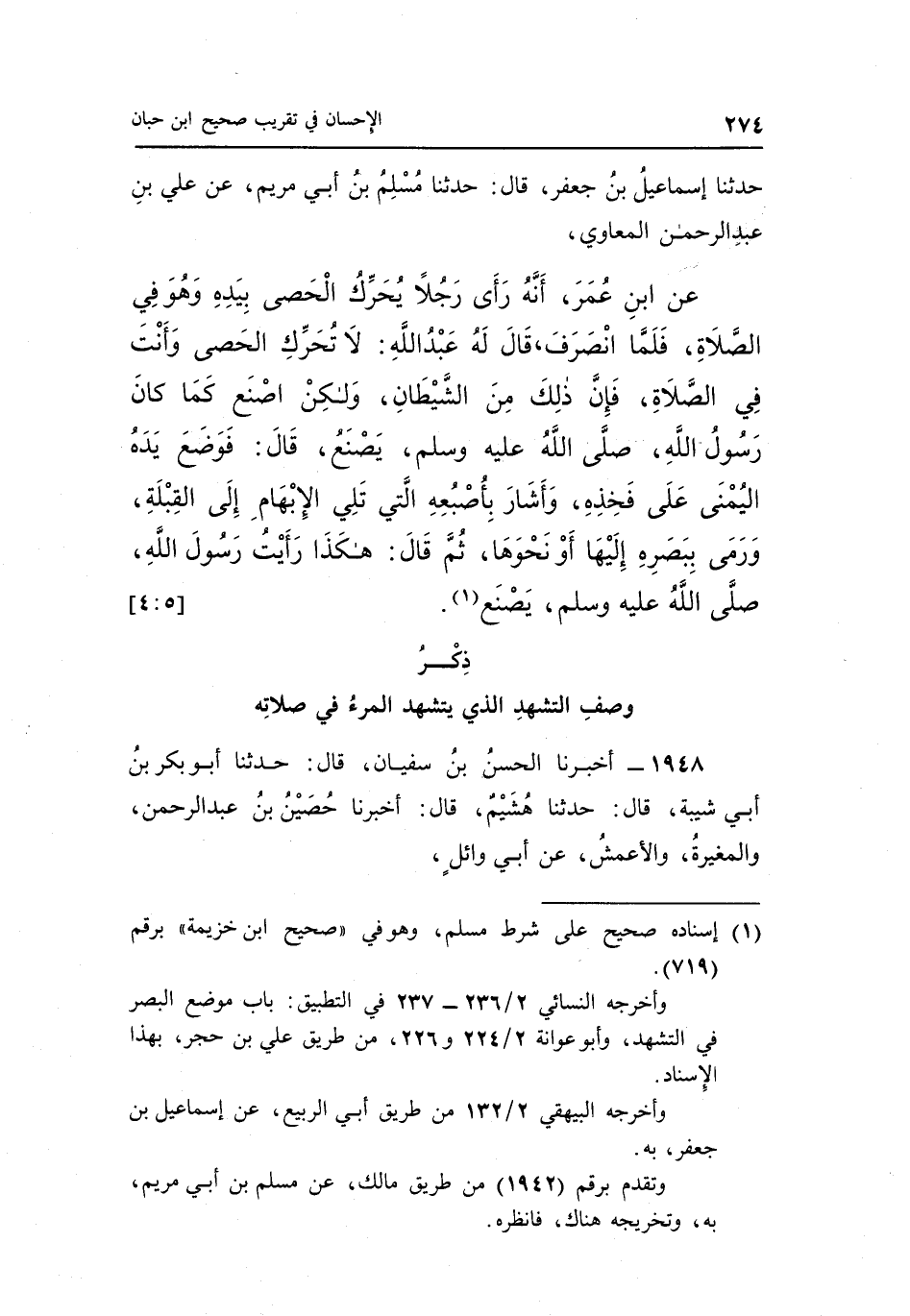 1948 - أَخْبَرَنَا الْحَسَنُ بْنُ سُفْيَانَ قَالَ: حَدَّثَنَا أَبُو بَكْرِ بْنُ أَبِي شَيْبَةَ قَالَ: حَدَّثَنَا هُشَيْمٌ قَالَ: أَخْبَرَنَا حُصَيْنُ بْنُ عَبْدِ الرَّحْمَنِ وَالْمُغِيرَةُ وَالْأَعْمَشُ عَنْ أَبِي وَائِلٍ,