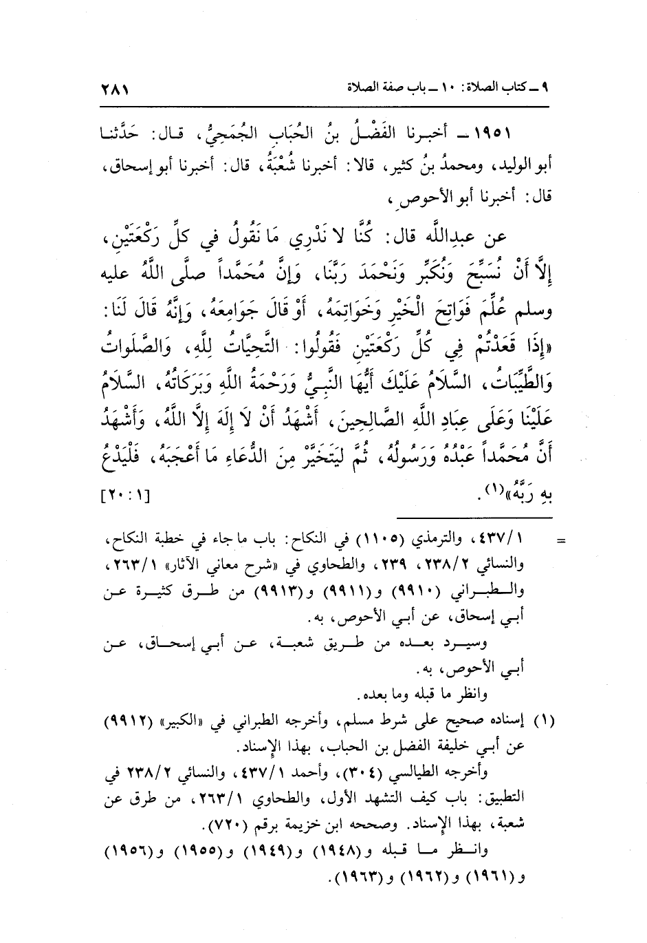 عَنْ عَبْدِ اللَّهِ قَالَ كُنَّا لَا نَدْرِي مَا نَقُولُ فِي كُلِّ رَكْعَتَيْنِ إِلَّا أَنْ نُسَبِّحَ وَنُكَبِّرَ وَنُحَمِّدَ رَبَّنَا وَإِنَّ مُحَمَّدًا صَلَّى اللَّهُ عَلَيْهِ وَسَلَّمَ عُلِّمَ فَوَاتِحَ الْخَيْرِ وَخَوَاتِمَهُ أَوْ قَالَ جَوَامِعَهُ وَإِنَّهُ قَالَ لَنَا: "إِذَا قَعَدْتُمْ فِي كُلِّ رَكْعَتَيْنِ فَقُولُوا التَّحِيَّاتُ لِلَّهِ وَالصَّلَوَاتُ وَالطَّيِّبَاتُ السَّلَامُ عَلَيْكَ أَيُّهَا النَّبِيُّ وَرَحْمَةُ اللَّهِ وَبَرَكَاتُهُ السَّلَامُ عَلَيْنَا وَعَلَى عِبَادِ اللَّهِ الصَّالِحِينَ أَشْهَدُ أَنْ لَا إِلَهَ إِلَّا اللَّهُ وَأَشْهَدُ أَنَّ مُحَمَّدًا عَبْدُهُ وَرَسُولُهُ ثُمَّ لِيَتَخَيَّرْ مِنَ الدُّعَاءِ مَا أَعْجَبَهُ فَلْيَدْعُ به ربه" 1. [1: 20]