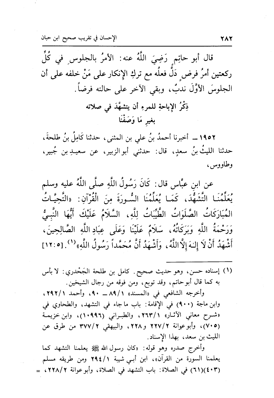 عن بن عَبَّاسٍ قَالَ كَانَ رَسُولُ اللَّهِ صَلَّى اللَّهُ عَلَيْهِ وَسَلَّمَ يُعَلِّمُنَا التَّشَهُّدَ كَمَا يُعَلِّمُنَا السُّورَةَ مِنَ الْقُرْآنِ: "التَّحِيَّاتُ الْمُبَارَكَاتُ الصَّلَوَاتُ الطَّيِّبَاتُ لِلَّهِ السَّلَامُ عَلَيْكَ أَيُّهَا النَّبِيُّ وَرَحْمَةُ اللَّهِ وَبَرَكَاتُهُ سَلَّامٌ عَلَيْنَا وَعَلَى عِبَادِ اللَّهِ الصَّالِحِينَ أَشْهَدُ أَنْ لَا إِلَهَ إِلَّا اللَّهُ وَأَنَّ مُحَمَّدًا رسول الله" 1. [5: 12]