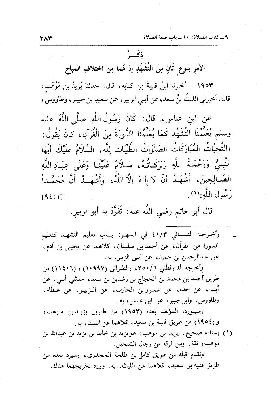 1953 - أخبرنا بن قُتَيْبَةَ مِنْ كِتَابِهِ قَالَ: حَدَّثَنَا يَزِيدُ بْنُ مَوْهِبٍ قَالَ أَخْبَرَنِي اللَّيْثُ بْنُ سَعْدٍ عَنْ أَبِي الزُّبَيْرِ عَنْ سعيد بن جبير وطاووس