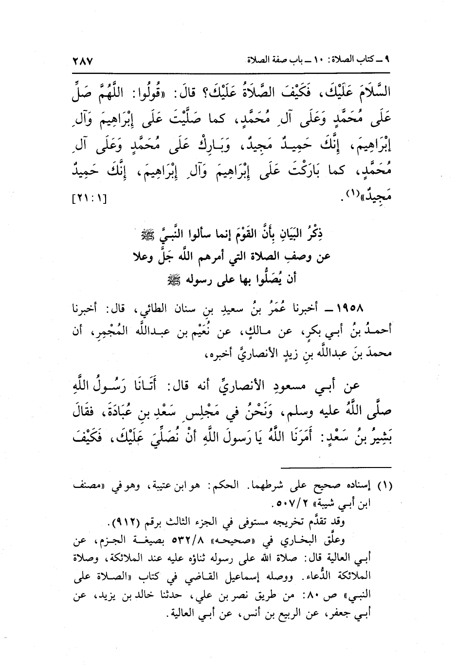 السَّلَامَ عَلَيْكَ فَكَيْفَ الصَّلَاةُ عَلَيْكَ قَالَ: "قُولُوا اللَّهُمَّ صَلِّ عَلَى مُحَمَّدٍ وَعَلَى آلِ مُحَمَّدٍ كَمَا صَلَّيْتَ عَلَى إِبْرَاهِيمَ وَآلِ إِبْرَاهِيمَ إِنَّكَ حَمِيدٌ مَجِيدٌ وَبَارِكْ عَلَى مُحَمَّدٍ وَعَلَى آلِ مُحَمَّدٍ كَمَا بَارَكْتَ عَلَى إِبْرَاهِيمَ وَآلِ إِبْرَاهِيمَ إنك حميد مجيد" 1. [1: 21]