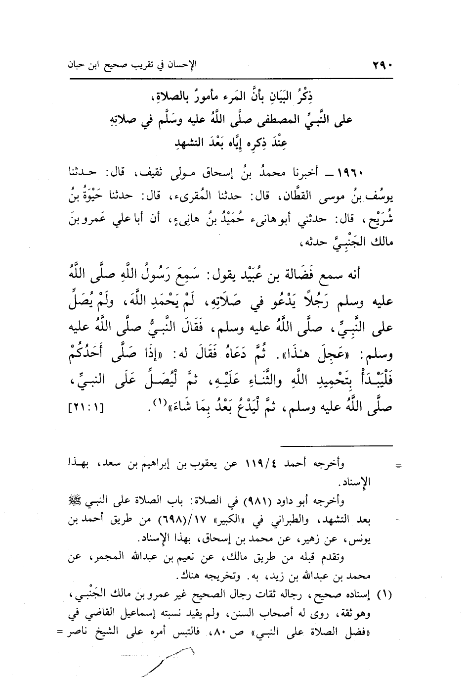 أَنَّهُ سَمِعَ فَضَالَةَ بْنَ عُبَيْدٍ يَقُولُ سَمِعَ رَسُولَ اللَّهِ صَلَّى اللَّهُ عَلَيْهِ وَسَلَّمَ رَجُلًا يَدْعُو فِي صَلَاتِهِ لَمْ يَحْمَدِ اللَّهَ وَلَمْ يُصَلِّ عَلَى النَّبِيِّ صَلَّى اللَّهُ عَلَيْهِ وَسَلَّمَ فَقَالَ النَّبِيُّ صَلَّى اللَّهُ عَلَيْهِ وَسَلَّمَ: "عَجِلَ هَذَا" ثُمَّ دَعَاهُ فَقَالَ لَهُ: "إِذَا صَلَّى أَحَدُكُمْ فَلْيَبْدَأْ بِتَحْمِيدِ اللَّهِ وَالثَّنَاءِ عَلَيْهِ ثُمَّ لِيُصَلِّ عَلَى النَّبِيِّ صَلَّى اللَّهُ عَلَيْهِ وَسَلَّمَ ثُمَّ ليدع بعد بما شاء" 1. [1: 21]