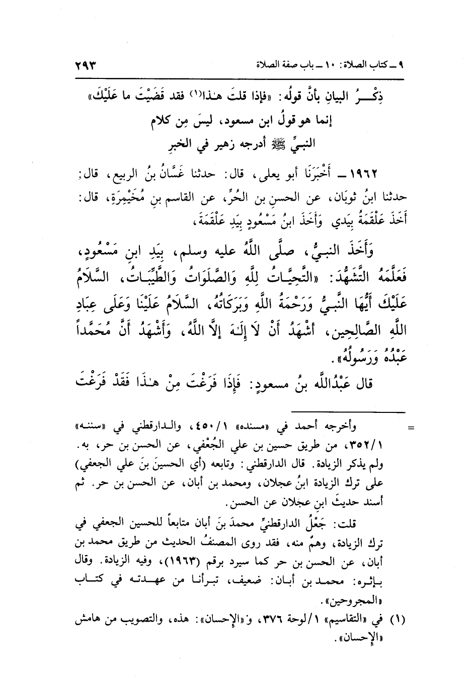 وَأَخَذَ النَّبِيُّ صَلَّى اللَّهُ عليه وسلم بيد بن مَسْعُودٍ فَعَلَّمَهُ التَّشَهُّدَ: "التَّحِيَّاتُ لِلَّهِ وَالصَّلَوَاتُ وَالطَّيِّبَاتُ السَّلَامُ عَلَيْكَ أَيُّهَا النَّبِيُّ وَرَحْمَةُ اللَّهِ وَبَرَكَاتُهُ السَّلَامُ عَلَيْنَا وَعَلَى عِبَادِ اللَّهِ الصَّالِحِينَ أَشْهَدُ أَنْ لَا إِلَهَ إِلَّا اللَّهُ وَأَشْهَدُ أَنَّ مُحَمَّدًا عَبْدُهُ وَرَسُولُهُ".