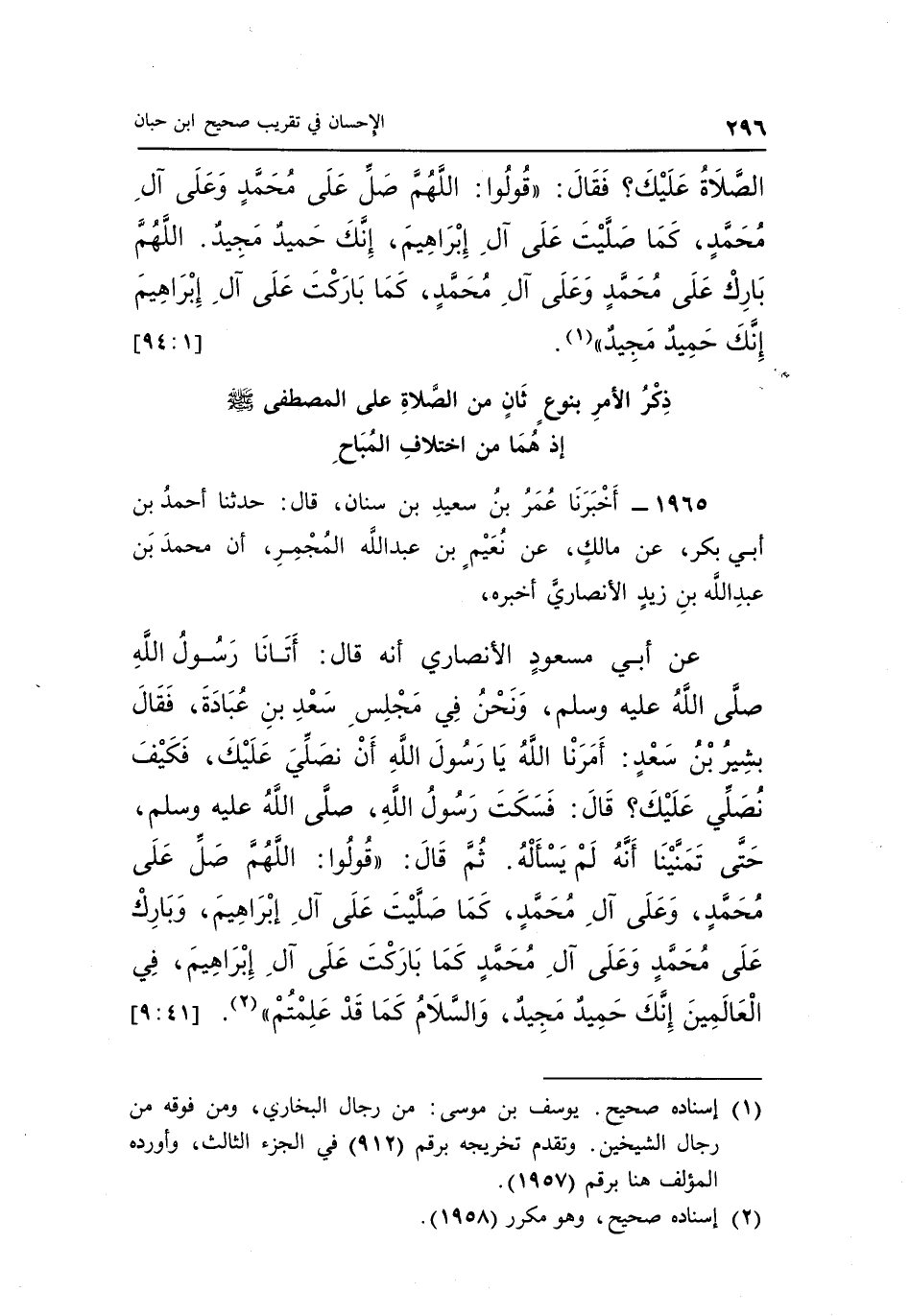 ذِكْرُ الْأَمْرِ بِنَوْعٍ ثَانٍ مِنَ الصَّلَاةِ عَلَى الْمُصْطَفَى صَلَّى اللَّهُ عَلَيْهِ وَسَلَّمَ إِذْ هُمَا مِنَ اخْتِلَافِ الْمُبَاحِ