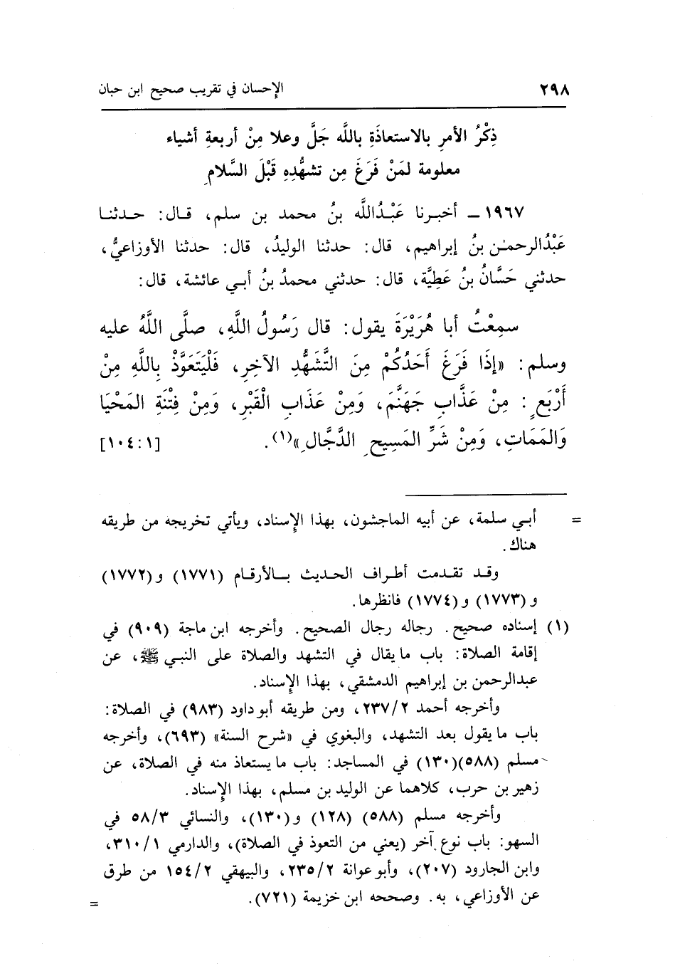 سَمِعْتُ أَبَا هُرَيْرَةَ يَقُولُ قَالَ رَسُولُ اللَّهِ صَلَّى اللَّهُ عَلَيْهِ وَسَلَّمَ: "إِذَا فَرَغَ أَحَدُكُمْ مِنَ التَّشَهُّدِ الْآخِرِ فَلْيَتَعَوَّذْ بِاللَّهِ مِنْ أَرْبَعٍ مِنْ عَذَابِ جَهَنَّمَ وَمِنْ عَذَابِ الْقَبْرِ وَمِنْ فِتْنَةِ الْمَحْيَا وَالْمَمَاتِ ومن شر المسيح الدجال" 1. [1: 104]