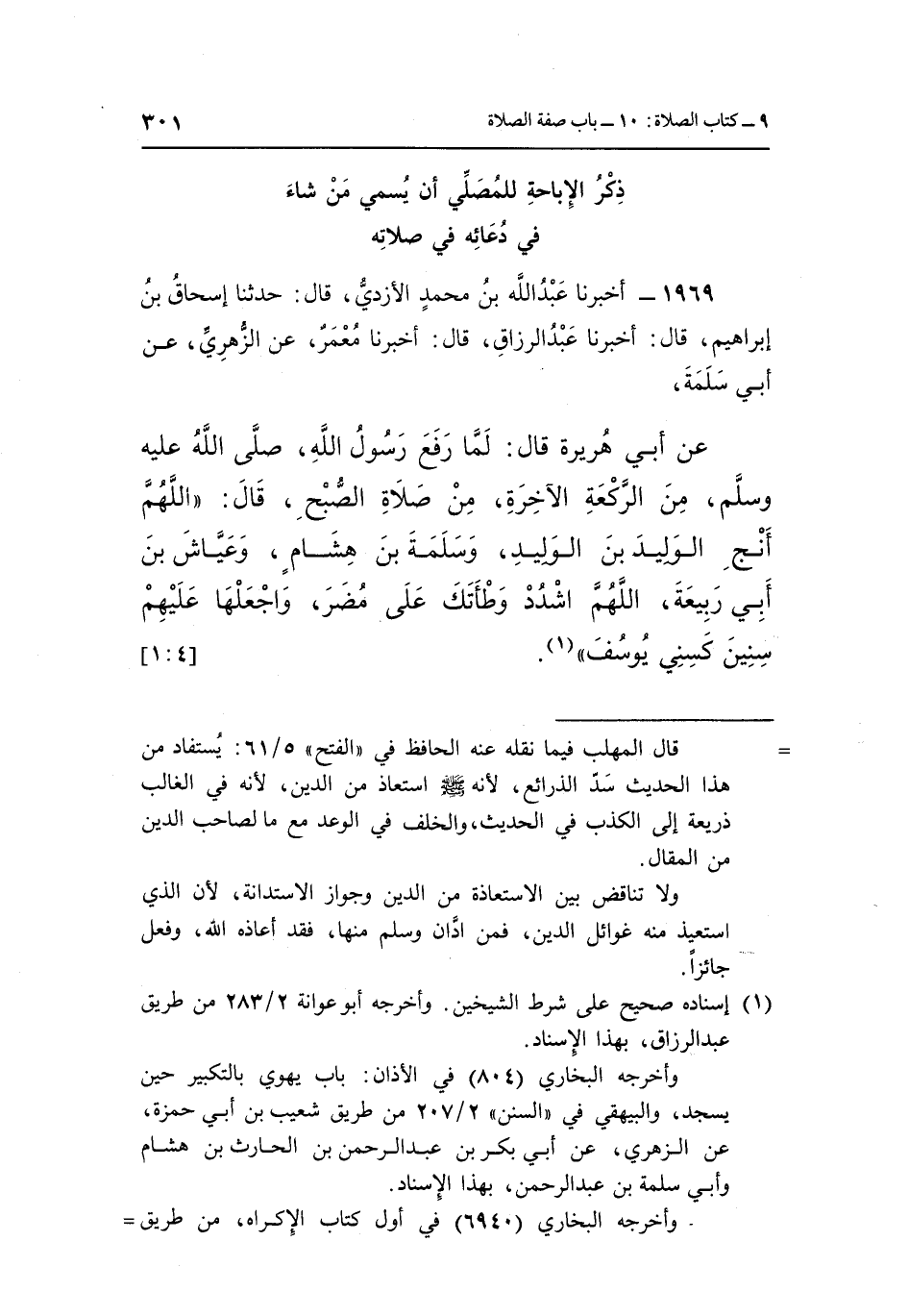 عَنْ أَبِي هُرَيْرَةَ قَالَ لَمَّا رَفَعَ رَسُولُ اللَّهِ صَلَّى اللَّهُ عَلَيْهِ وَسَلَّمَ مِنَ الرَّكْعَةِ الْآخِرَةِ مِنْ صَلَاةِ الصُّبْحِ قَالَ: "اللَّهُمَّ أَنْجِ الْوَلِيدَ بْنَ الْوَلِيدِ وَسَلَمَةَ بْنَ هِشَامٍ وَعَيَّاشَ بْنَ أَبِي رَبِيعَةَ اللَّهُمَّ اشْدُدْ وَطْأَتَكَ عَلَى مُضَرَ واجعلها عليهم سنين كسني يوسف1". [4: 1]