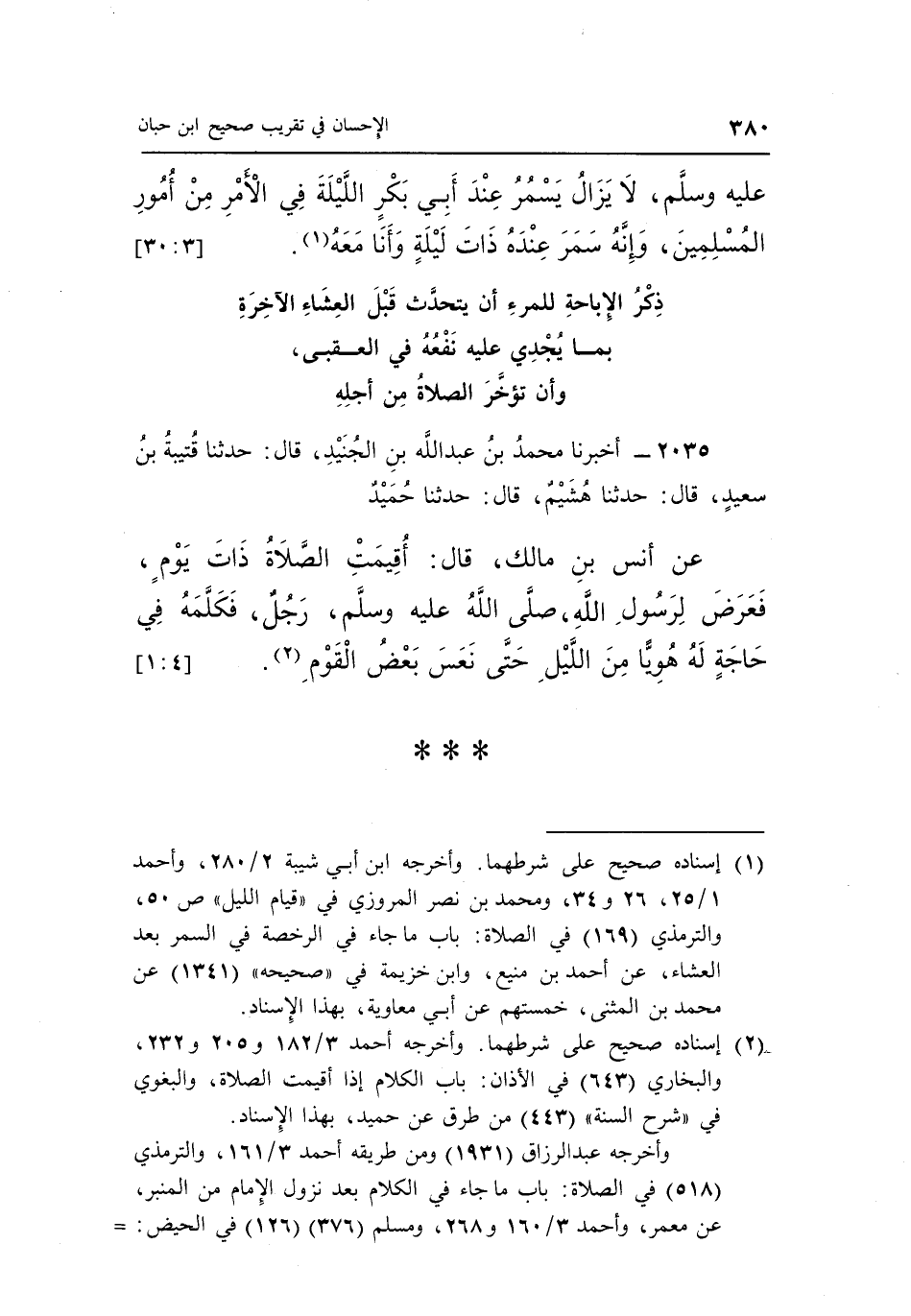 عَنْ أَنَسِ بْنِ مَالِكٍ قَالَ أُقِيمَتِ الصَّلَاةُ ذَاتَ يَوْمٍ فَعَرَضَ لِرَسُولِ اللَّهِ صَلَّى اللَّهُ عَلَيْهِ وَسَلَّمَ رَجُلٌ فَكَلَّمَهُ فِي حَاجَةٍ لَهُ هُوِيًّا مِنَ اللَّيْلِ حَتَّى نَعَسَ بعض القوم 2. [4: 1]