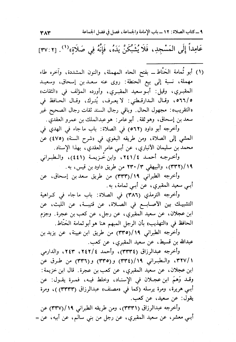 عَامِدًا إِلَى الْمَسْجِدِ فَلَا يُشَبِّكَنَّ يَدَهُ فَإِنَّهُ في صلاة" 1. [2: 37]