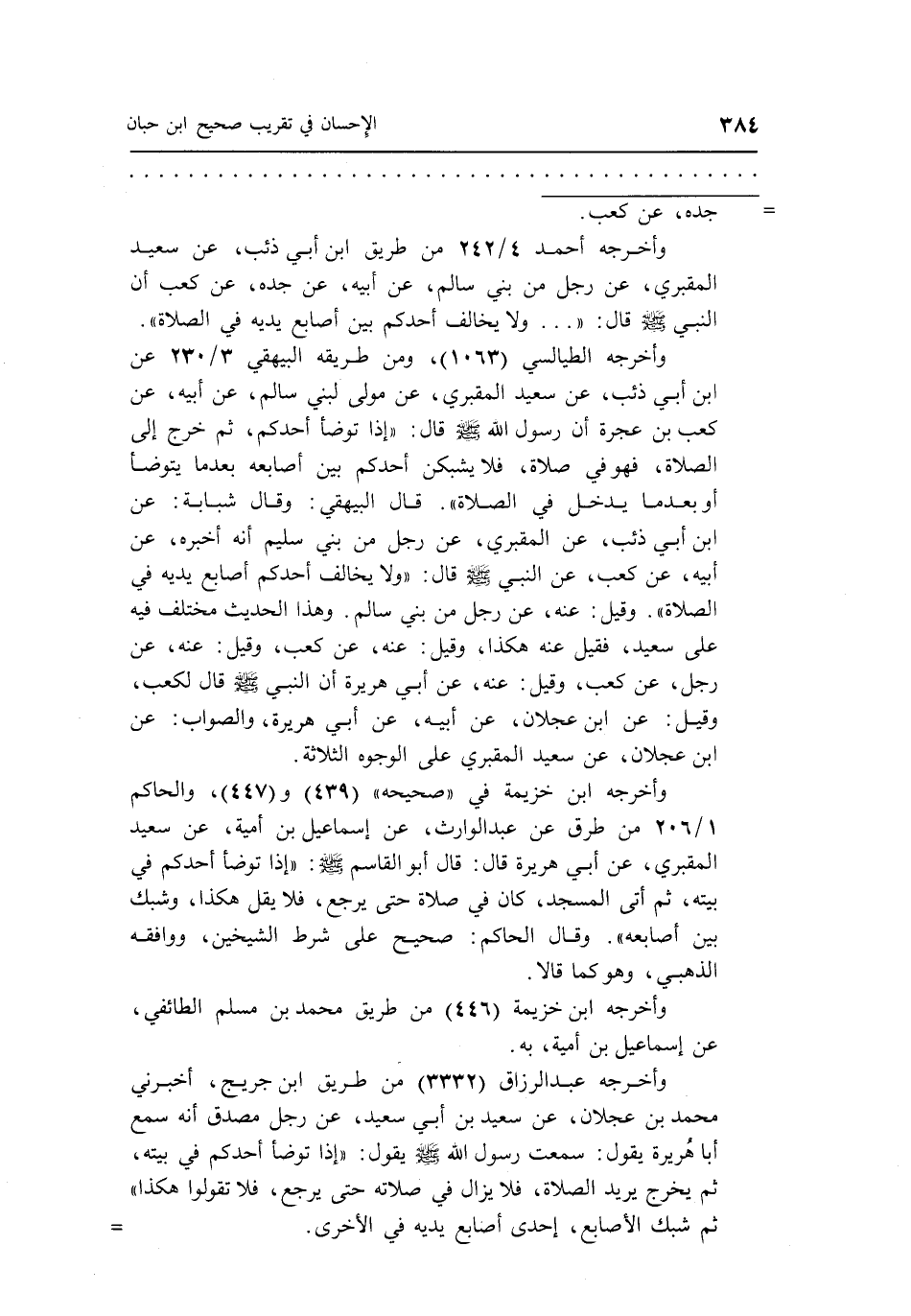 وأخرجه الطيالسي "1063"، ومن طريقه البيهقي 3/230 عن ابن أبي ذئب، عن سعيد المقبري، عن مولى لبني سالم، عن أبيه، عن كعب بن عجرة أن رسول الله صلى الله عليه وسلم قال: "إذا توضأ أحدكم، ثم خرج إلى الصلاة، فهو في صلاة، فلا يشبكن أحدك بين أصابعه بعدما يتوضأ أو بعدما يدخل في الصلاة". قال البيهقي: وقال شبابة: عن ابن أبي ذئب، عن المقبري، عن رجل من بني سليم أنه أخبره، عن أبيه، عن كعب، عن النبي صلى الله عليه وسلم قال: "ولا يخالف أحدكم أصابع يديه في الصلاة". وقيل: عنه، عن رجل من بني سالم. وهذا الحديث مختلف فيه على سعيد، فقيل عنه هكذا، وقيل: عنه، عن كعب، وقيل: عنه، عن رجل، عن كعب، وقيل: عنه، عن أبي هريرة أن النبي صلى الله عليه وسلم قال لكعب، وقيل: عن ابن عجلان، عن أبيه، عن أبي هريرة، والصواب: عن ابن عجلان، عن سعيد المقبري على الوجوه الثلاثة.