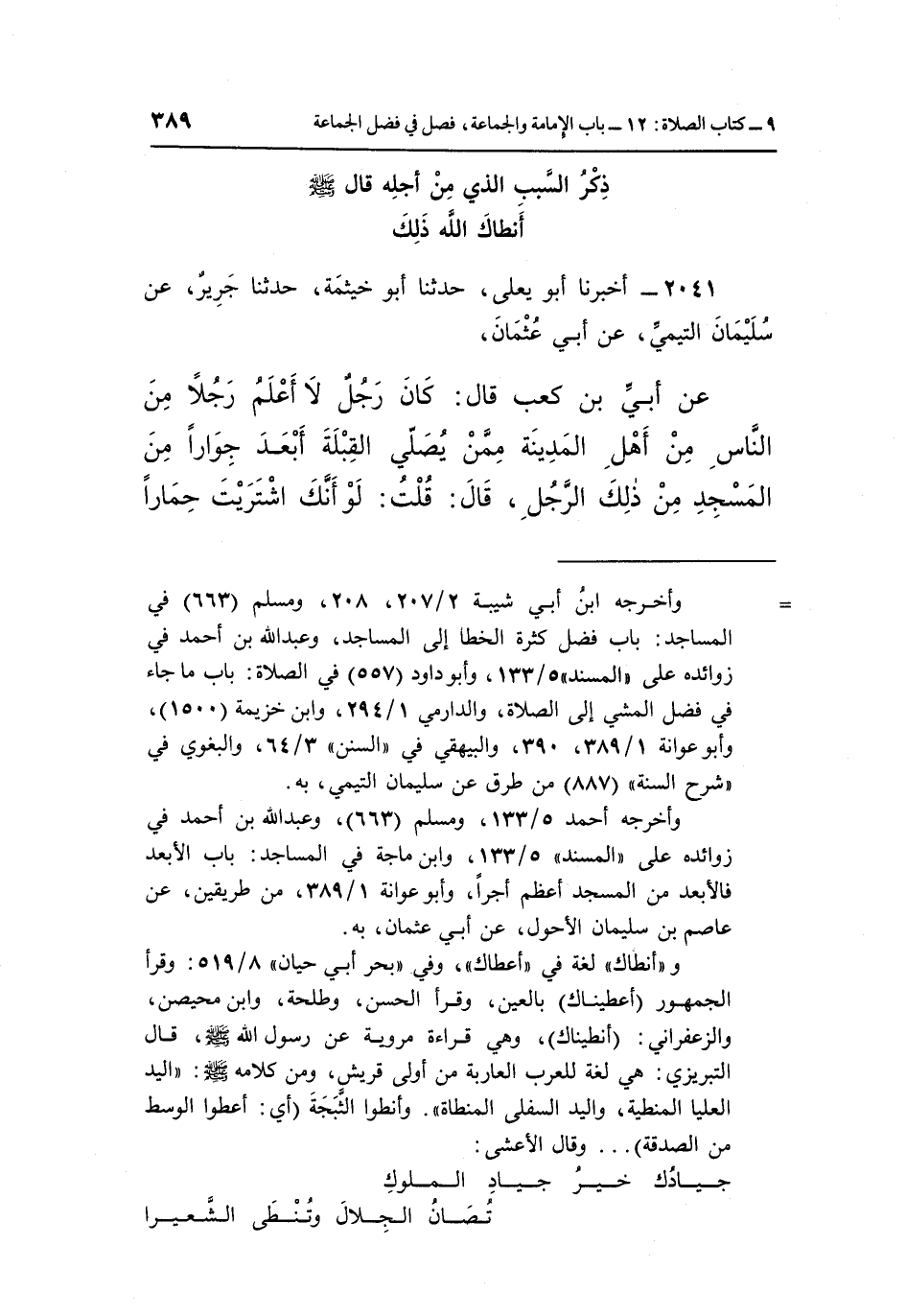 عَنْ أُبَيِّ بْنِ كَعْبٍ قَالَ: كَانَ رَجُلٌ لَا أَعْلَمُ رَجُلًا مِنَ النَّاسِ مِنْ أَهْلِ الْمَدِينَةِ مِمَّنْ يُصَلِّي الْقِبْلَةَ أَبْعَدَ جِوَارًا مِنَ الْمَسْجِدِ مِنْ ذَلِكَ الرَّجُلِ قَالَ قُلْتُ لو أنك اشتريت حمارا