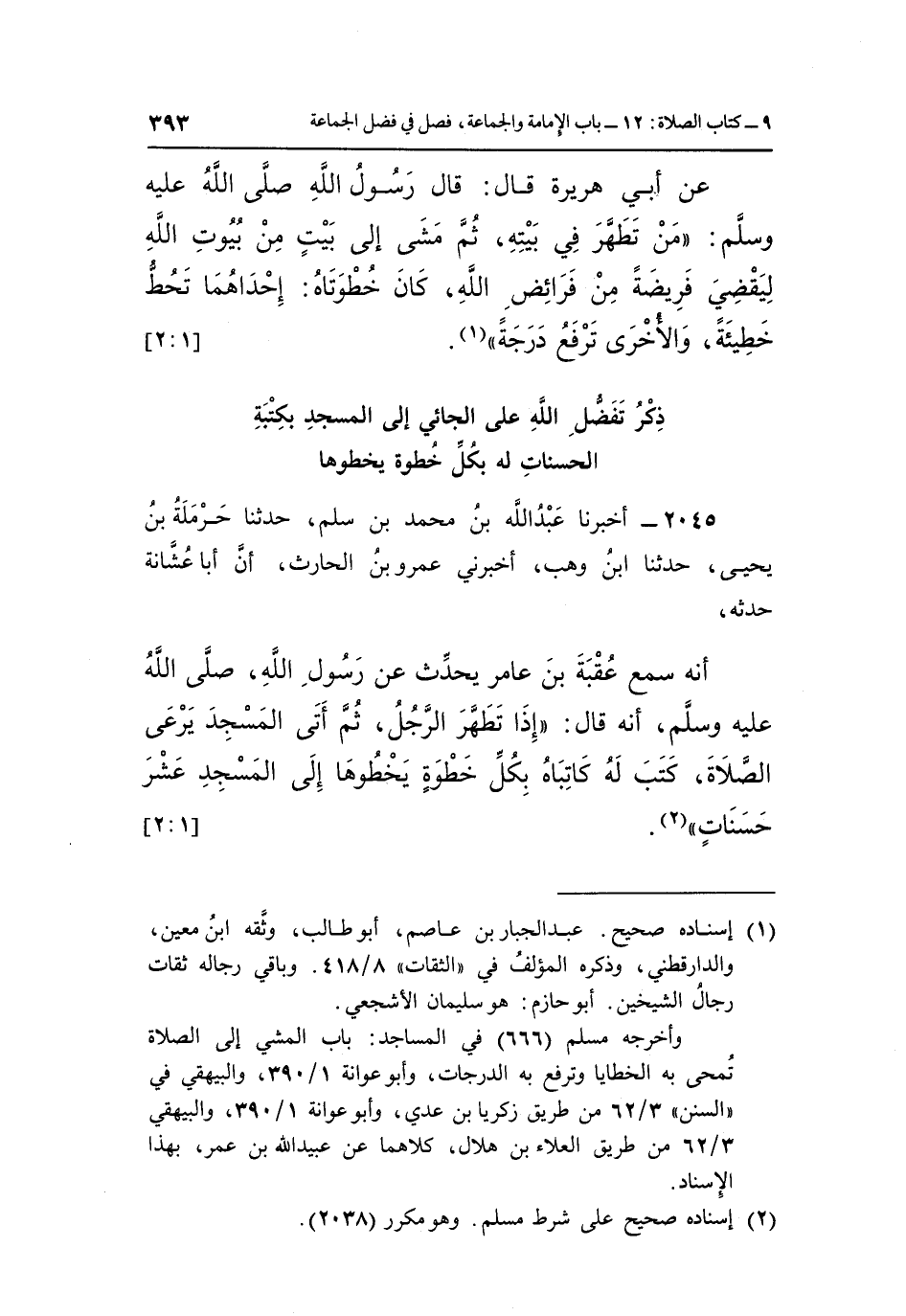 عَنْ أَبِي هُرَيْرَةَ قَالَ قَالَ رَسُولُ اللَّهِ صَلَّى اللَّهُ عَلَيْهِ وَسَلَّمَ: "مَنْ تَطَهَّرَ فِي بَيْتِهِ ثُمَّ مَشَى إِلَى بَيْتٍ مِنْ بُيُوتِ اللَّهِ لِيَقْضِيَ فَرِيضَةً مِنْ فَرَائِضِ اللَّهِ كَانَ خَطْوَتَاهُ إِحْدَاهُمَا تَحُطُّ خَطِيئَةً وَالْأُخْرَى تَرْفَعُ دَرَجَةً" 1. [1: 2]