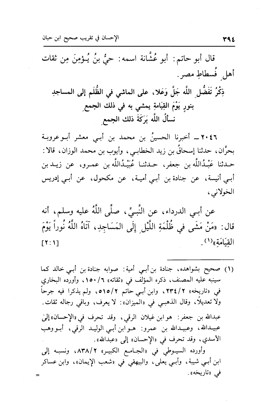 1 صحيح بشواهده، جنادة بن أبي أمية: صوابه جنادة بن أبي خالد كما سينبه عليه المصنف، ذكره المؤلف في ثقاته 6/150، وأورده البخاري في تاريخه 2/234، وابن أبي حاتم 2/515، ولم يذكرا فيه جرحاً ولا تعديلاً، وقال الذهبي في الميزان: لا يعرف، وباقي رجاله ثقات.